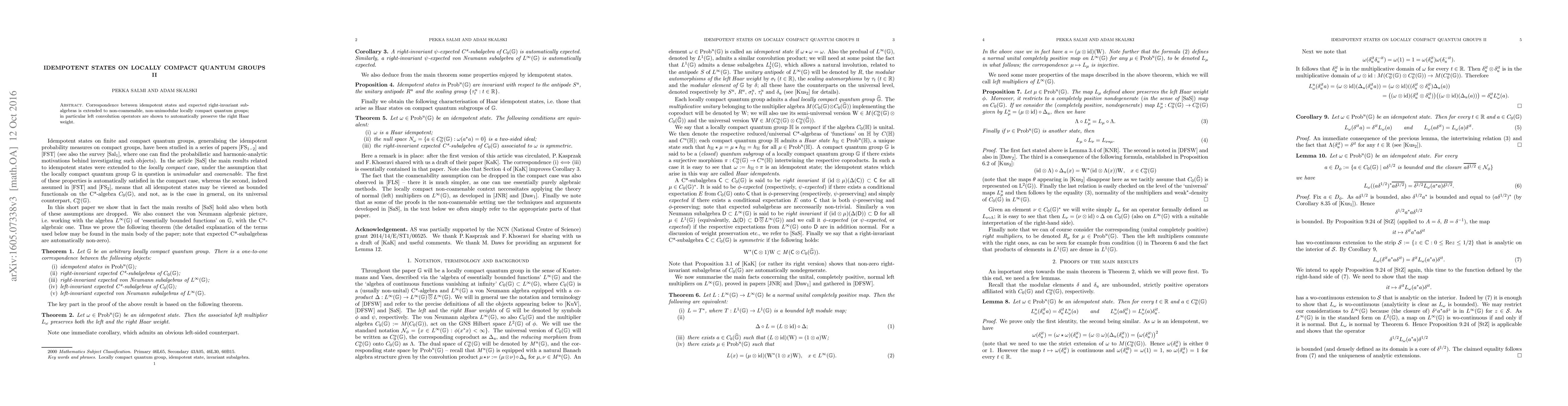 Correspondence between idempotent states and expected right-invariant subalgebras is extended to non-coamenable, non-unimodular locally compact quantum groups; in particular left convolution operators are shown to automatically preserve the right Haar weight.