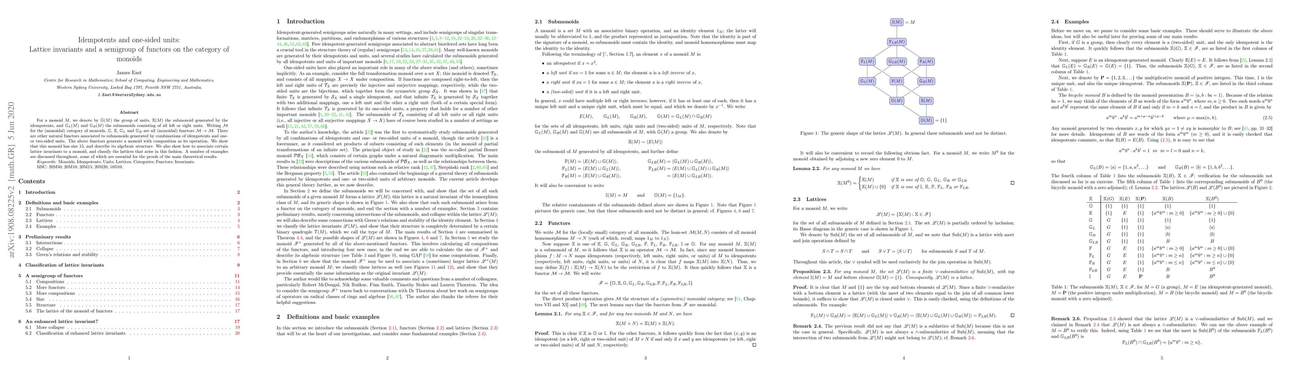 This paper investigates monoidal functors on the category of monoids generated by groups of units, idempotents, and one-sided units. It reveals that these functors form a semigroup of size 15 with a detailed algebraic structure, and associates lattice invariants to monoids, classifying the resultant lattices.