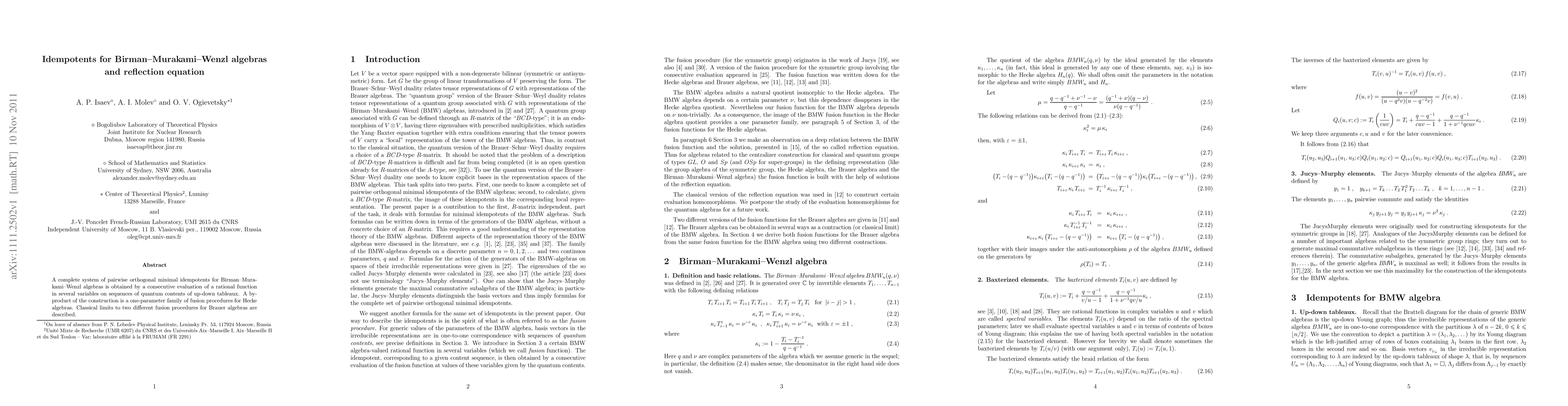 This paper constructs a complete system of minimal idempotents for Birman-Murakami-Wenzl algebras using rational functions evaluated on sequences of quantum contents from up-down tableaux. It also introduces a family of fusion procedures for Hecke algebras and describes classical limits related to Brauer algebras.