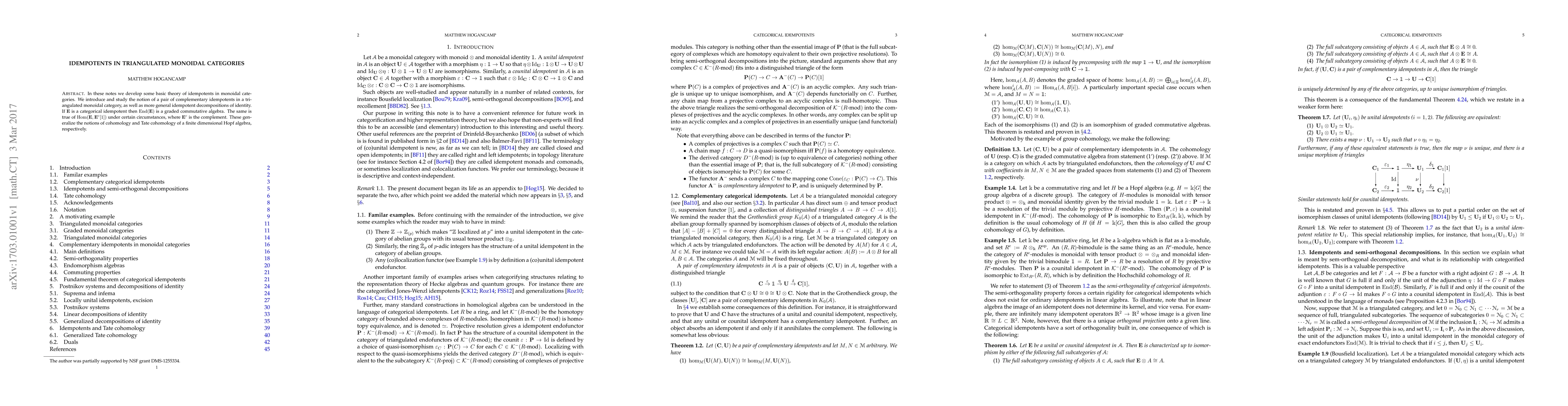 In these notes we develop some basic theory of idempotents in monoidal categories. We introduce and study the notion of a pair of complementary idempotents in a triangulated monoidal category, as well as more general idempotent decompositions of identity. If $\mathbf{E}$ is a categorical idempotent then $\operatorname{End}(\mathbf{E})$ is a graded commutative algebra. The same is true of $\operatorname{Hom}(\mathbf{E},\mathbf{E}^c[1])$ under certain circumstances, where $\mathbf{E}^c$ is the complement. These generalize the notions of cohomology and Tate cohomology of a finite dimensional Hopf algebra, respectively.