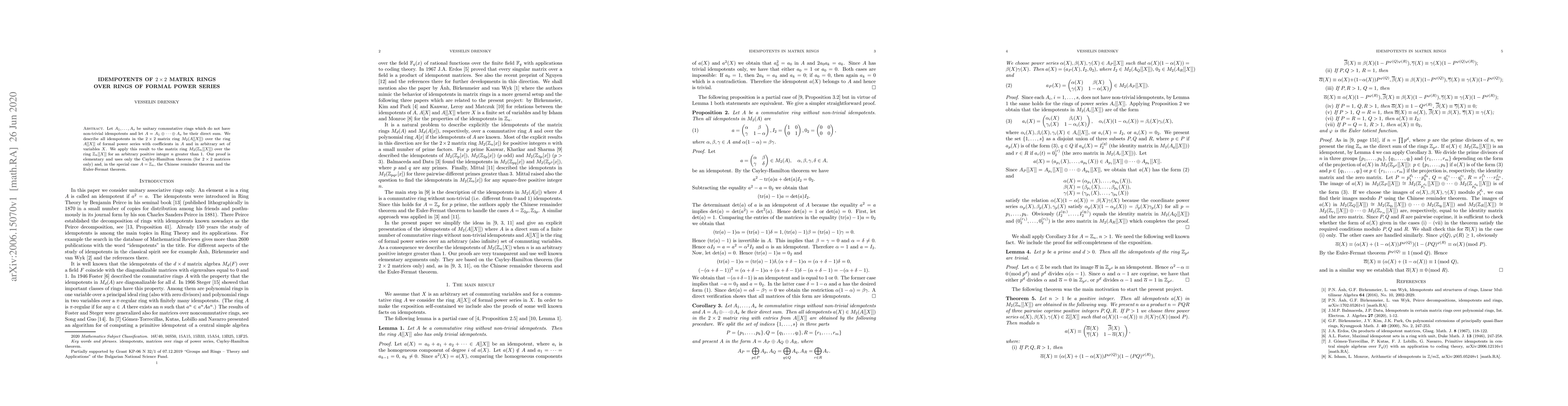 Let $A_1,\ldots,A_s$ be unitary commutative rings which do not have non-trivial idempotents and let $A=A_1\oplus\cdots\oplus A_s$ be their direct sum. We describe all idempotents in the $2\times 2$ matrix ring $M_2(A[[X]])$ over the ring $A[[X]]$ of formal power series with coefficients in $A$ and in arbitrary set of variables $X$. We apply this result to the matrix ring $M_2({\mathbb Z}_n[[X]])$ over the ring ${\mathbb Z}_n[[X]]$ for an arbitrary positive integer $n$ greater than 1. Our proof is elementary and uses only the Cayley-Hamilton theorem (for $2\times 2$ matrices only) and, in the special case $A={\mathbb Z}_n$, the Chinese reminder theorem and the Euler-Fermat theorem.