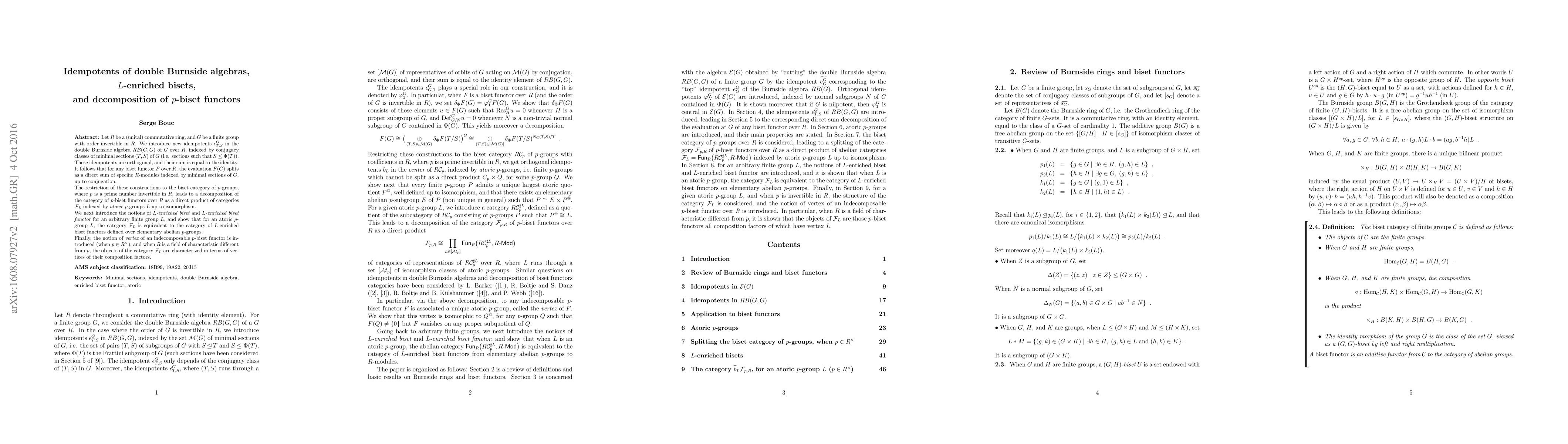 This paper introduces new idempotents in the double Burnside algebra for finite groups, leading to a decomposition of p-biset functors over a commutative ring. It also defines L-enriched biset functors and characterizes indecomposable p-biset functors in terms of their vertices.