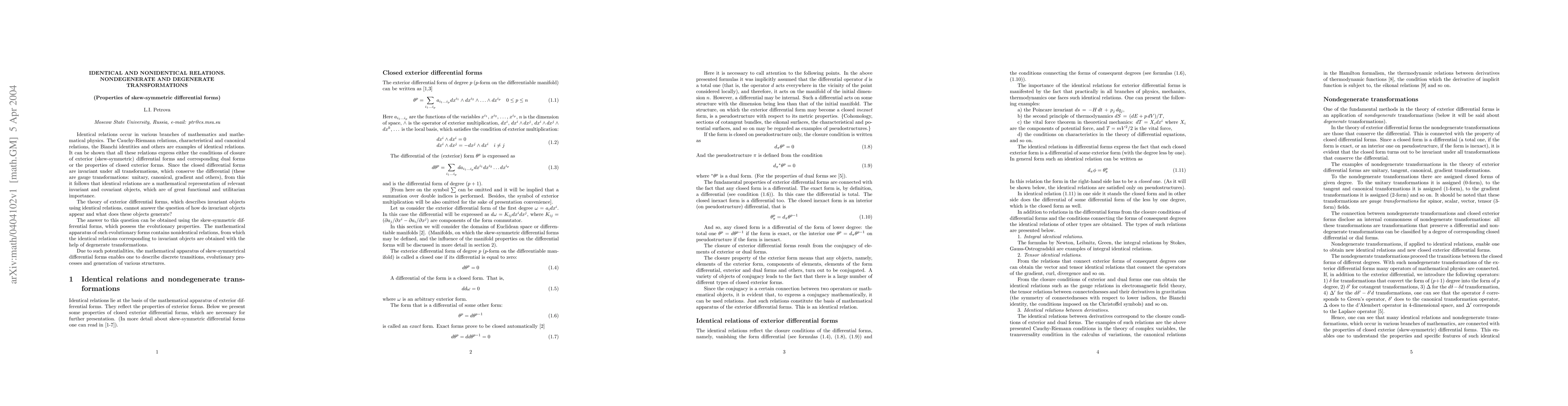 The paper discusses identical and nonidentical relations in the context of nondegenerate and degenerate transformations, focusing on properties of skew-symmetric differential forms.