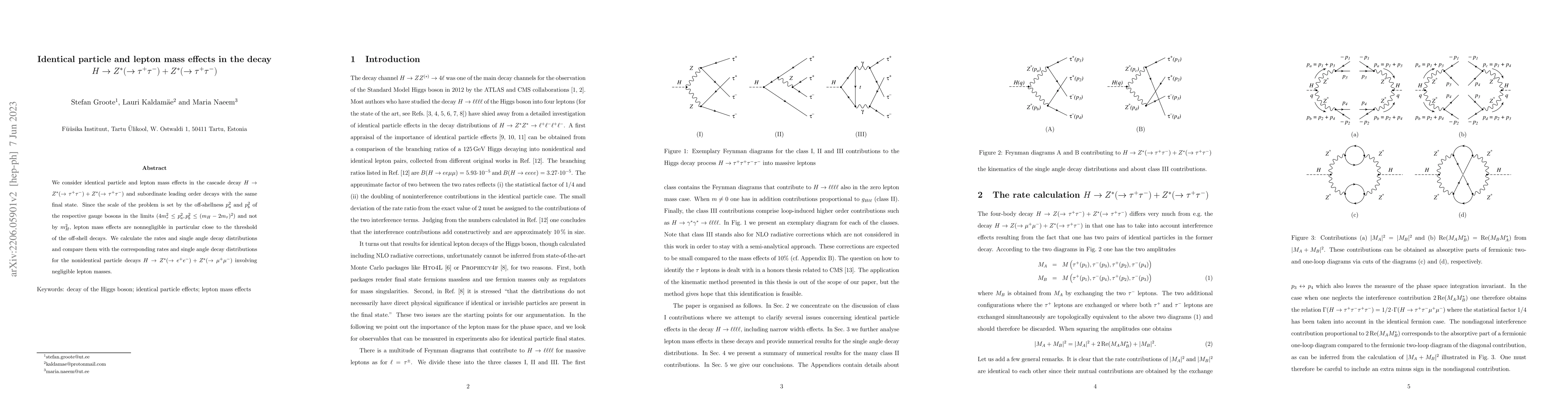 This paper investigates the impact of identical particle and lepton mass effects in the decay $H\to Z^\ast(\to\tau^+\tau^-)+Z^\ast(\to\tau^+\tau^-)$, finding that lepton mass effects are significant due to the off-shell nature of the gauge bosons. It compares these effects with the decay $H\to Z^\ast(\to e^+e^-)+Z^\ast(\to\mu^+\mu^-)$ where lepton masses are negligible.
