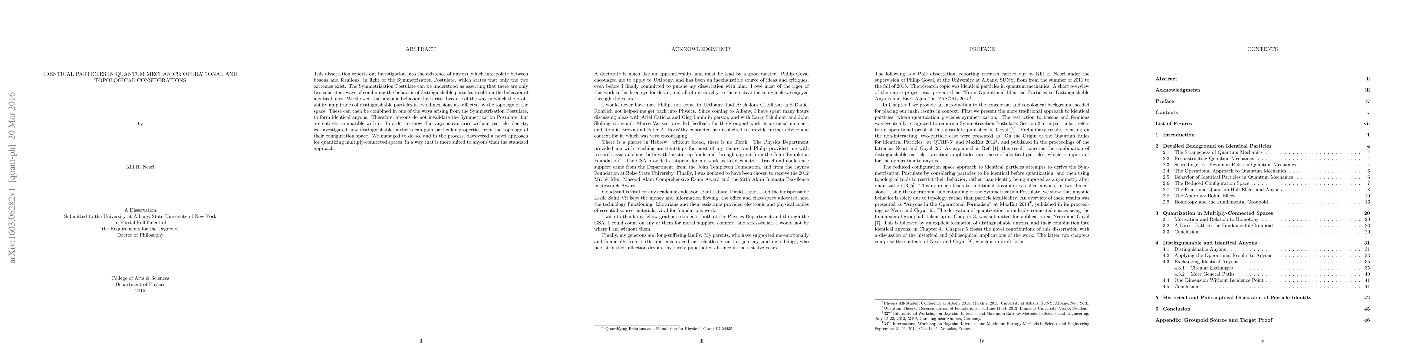 This dissertation reports our investigation into the existence of anyons, which interpolate between bosons and fermions, in light of the Symmetrization Postulate, which states that only the two extremes exist. The Symmetrization Postulate can be understood as asserting that there are only two consistent ways of combining the behavior of distinguishable particles to obtain the behavior of identical ones. We showed that anyonic behavior then arises because of the way in which the probability amplitudes of distinguishable particles in two dimensions are affected by the topology of the space. These can then be combined in one of the ways arising from the Symmetrization Postulate, to form identical anyons. Therefore, anyons do not invalidate the Symmetrization Postulate, but are entirely compatible with it. In order to show that anyons can arise without particle identity, we investigated how distinguishable particles can gain particular properties from the topology of their configuration space. We managed to do so, and in the process, discovered a novel approach for quantizing multiply-connected spaces, in a way that is more suited to anyons than the standard approach.