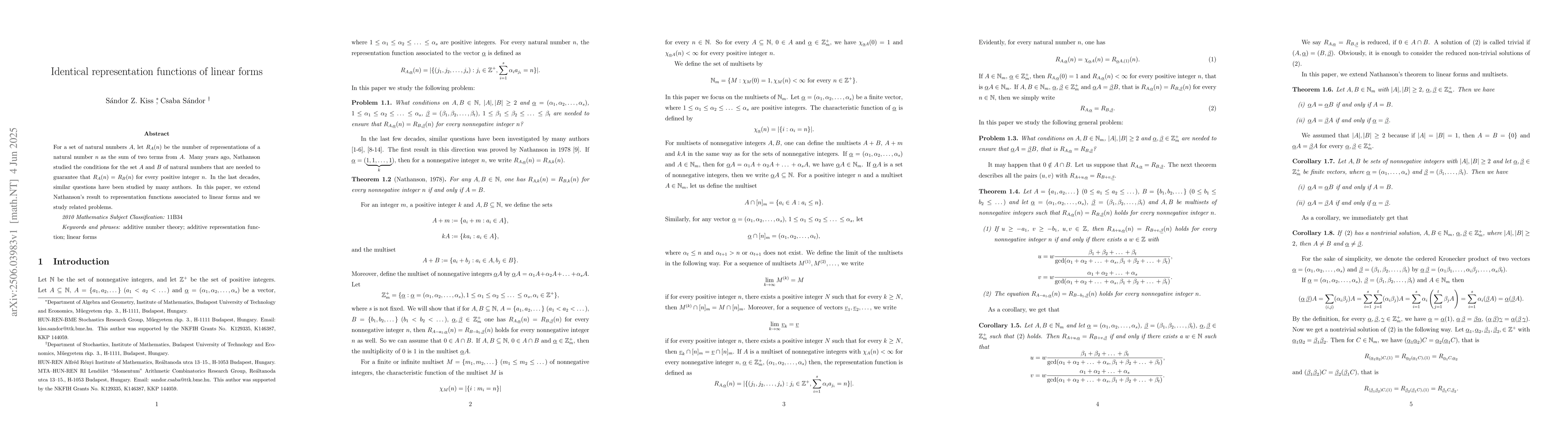For a set of natural numbers $A$, let $R_{A}(n)$ be the number of representations of a natural number $n$ as the sum of two terms from $A$. Many years ago, Nathanson studied the conditions for the set $A$ and $B$ of natural numbers that are needed to guarantee that $R_{A}(n) = R_{B}(n)$ for every positive integer $n$. In the last decades, similar questions have been studied by many authors. In this paper, we extend Nathanson's result to representation functions associated to linear forms and we study related problems.
