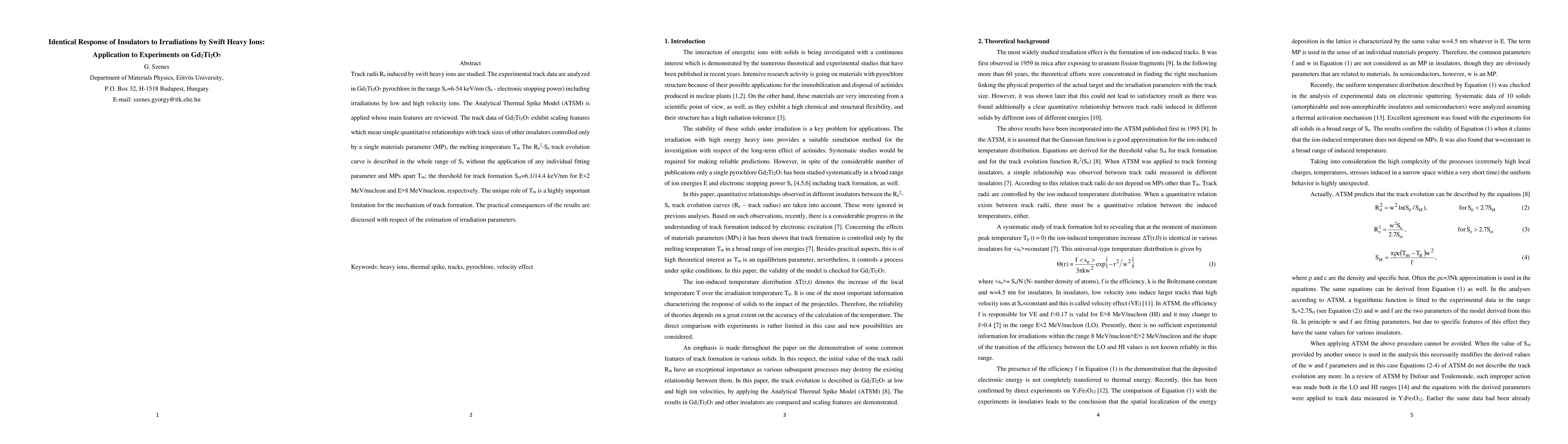 Track radii Re induced by swift heavy ions are studied. The experimental track data are analyzed in Gd2Ti2O7 pyrochlore in the range Se=6-54 keV/nm (Se - electronic stopping power) including irradiations by low and high velocity ions. The Analytical Thermal Spike Model (ATSM) is applied whose main features are reviewed. The track data of Gd2Ti2O7 exhibit scaling features which mean simple quantitative relationships with track sizes of other insulators controlled only by a single materials parameter (MP), the melting temperature Tm. The Re2-Se track evolution curve is described in the whole range of Se without the application of any individual fitting parameter and MPs apart Tm; the threshold for track formation Set=6.1/14.4 keV/nm for E<2 MeV/nucleon and E>8 MeV/nucleon, respectively. The unique role of Tm is a highly important limitation for the mechanism of track formation. The practical consequences of the results are discussed with respect of the estimation of irradiation parameters