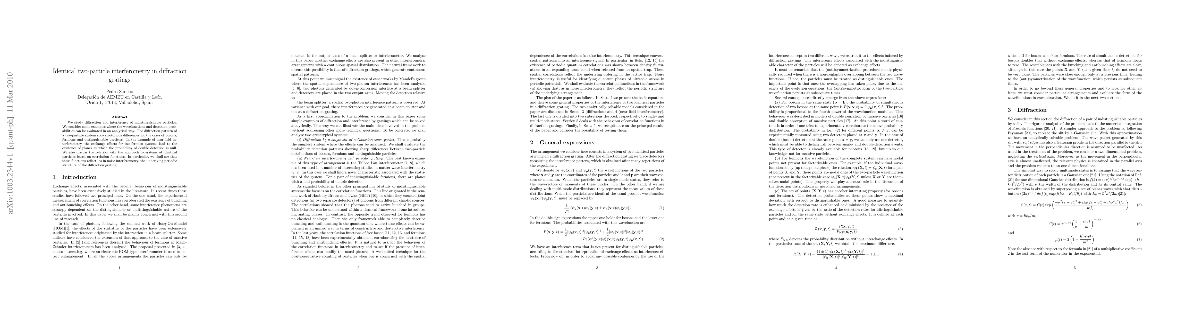 We study diffraction and interference of indistinguishable particles. We consider some examples where the wavefunctions and detection probabilities can be evaluated in an analytical way. The diffraction pattern of a two-particle system shows notorious differences for the cases of bosons, fermions and distinguishable particles. In the example of near-field interferometry, the exchange effects for two-fermion systems lead to the existence of planes at which the probability of double detection is null. We also discuss the relation with the approach to systems of identical particles based on correlation functions. In particular, we shall see that these functions reflect, as in noise interferometry, the underlying periodic structure of the diffraction grating.