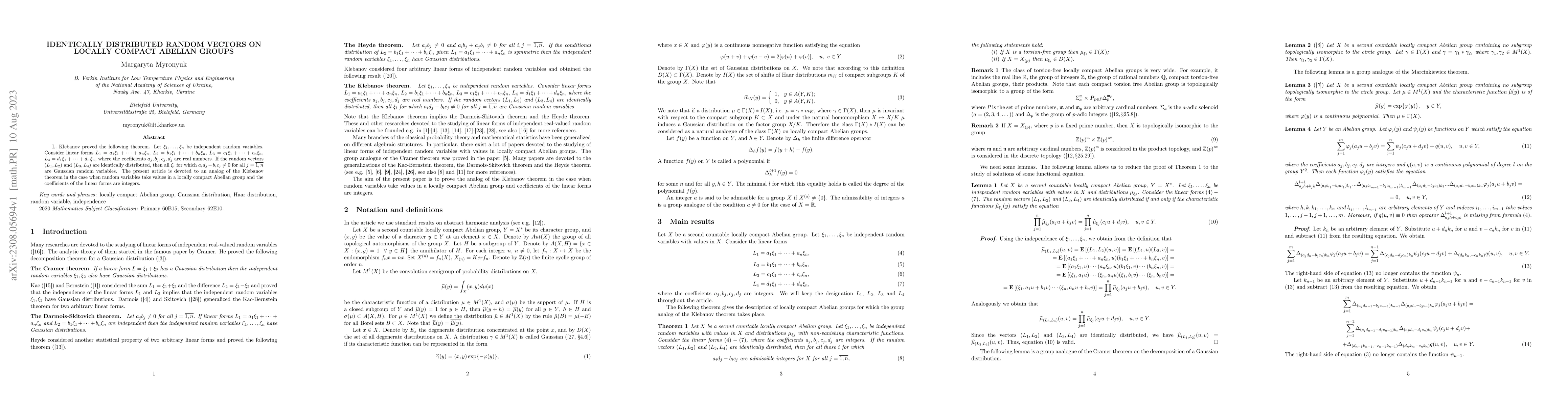 This paper extends Klebanov's theorem to locally compact Abelian groups, proving that if identically distributed random vectors in such groups yield certain linear forms, then specific random variables must be Gaussian when the coefficients of these forms are integers.
