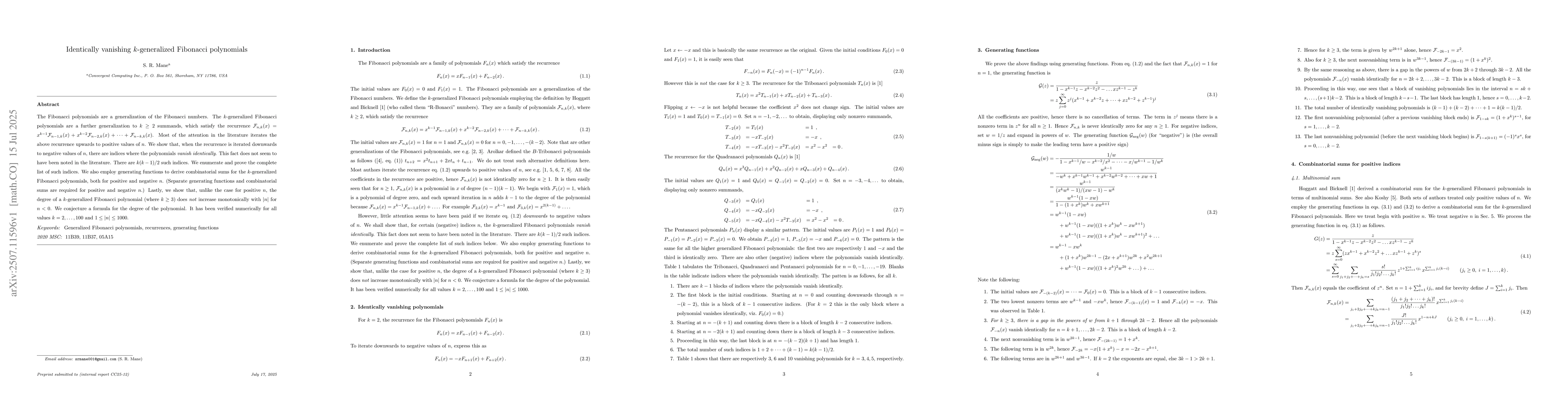 The Fibonacci polynomials are a generalization of the Fibonacci numbers. The $k$-generalized Fibonacci polynomials are a further generalization to $k\ge2$ summands, which satisfy the recurrence $\mathcal{F}_{n,k}(x) = x^{k-1}\mathcal{F}_{n-1,k}(x) +x^{k-2}\mathcal{F}_{n-2,k}(x) +\dots +\mathcal{F}_{n-k,k}(x)$. Most of the attention in the literature iterates the above recurrence upwards to positive values of $n$. We show that, when the recurrence is iterated downwards to negative values of $n$, there are indices where the polynomials $vanish\; identically$. This fact does not seem to have been noted in the literature. There are $k(k-1)/2$ such indices. We enumerate and prove the complete list of such indices. We also employ generating functions to derive combinatorial sums for the $k$-generalized Fibonacci polynomials, both for positive and negative $n$. (Separate generating functions and combinatorial sums are required for positive and negative $n$.) Lastly, we show that, unlike the case for positive $n$, the degree of a $k$-generalized Fibonacci polynomial (where $k\ge3$) does $not$ increase monotonically with $|n|$ for $n<0$. We conjecture a formula for the degree of the polynomial. It has been verified numerically for all values $k=2,\dots,100$ and $1 \le |n| \le 1000$.
