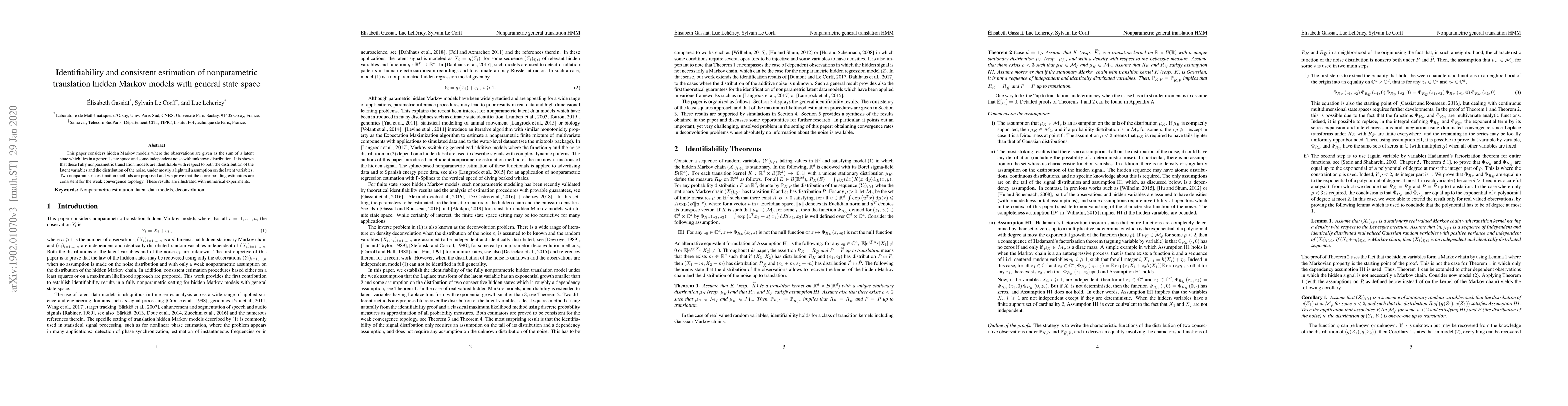This paper demonstrates the identifiability of nonparametric translation hidden Markov models with general state space and proposes two consistent estimation methods. Numerical experiments validate the theoretical results.