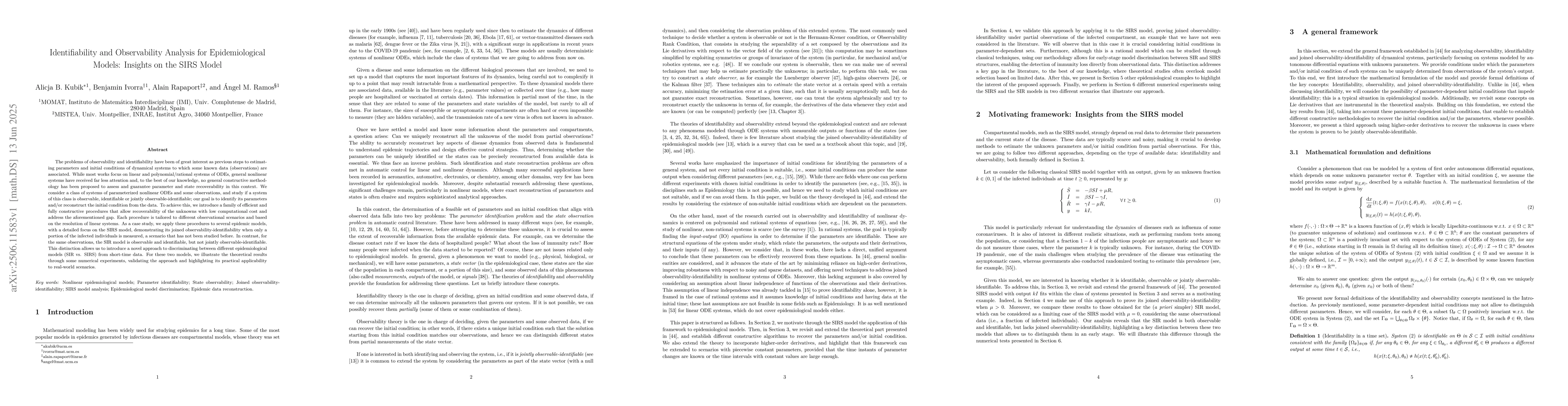 The problems of observability and identifiability have been of great interest as previous steps to estimating parameters and initial conditions of dynamical systems to which some known data (observations) are associated. While most works focus on linear and polynomial/rational systems of ODEs, general nonlinear systems have received far less attention and, to the best of our knowledge, no general constructive methodology has been proposed to assess and guarantee parameter and state recoverability in this context. We consider a class of systems of parameterized nonlinear ODEs and some observations, and study if a system of this class is observable, identifiable or jointly observable-identifiable; our goal is to identify its parameters and/or reconstruct the initial condition from the data. To achieve this, we introduce a family of efficient and fully constructive procedures that allow recoverability of the unknowns with low computational cost and address the aforementioned gap. Each procedure is tailored to different observational scenarios and based on the resolution of linear systems. As a case study, we apply these procedures to several epidemic models, with a detailed focus on the SIRS model, demonstrating its joined observability-identifiability when only a portion of the infected individuals is measured, a scenario that has not been studied before. In contrast, for the same observations, the SIR model is observable and identifiable, but not jointly observable-identifiable. This distinction allows us to introduce a novel approach to discriminating between different epidemiological models (SIR vs. SIRS) from short-time data. For these two models, we illustrate the theoretical results through some numerical experiments, validating the approach and highlighting its practical applicability to real-world scenarios.