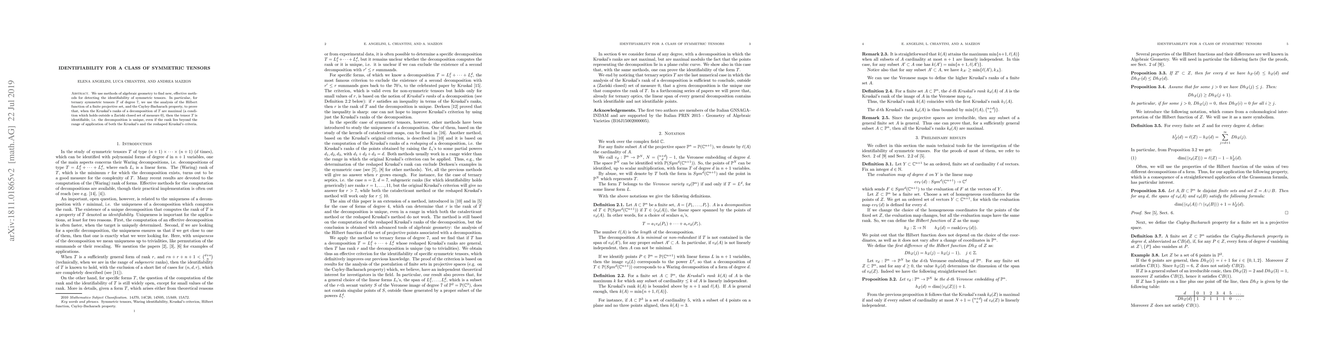 We use methods of algebraic geometry to find new, effective methods for detecting the identifiability of symmetric tensors. In particular, for ternary symmetric tensors T of degree 7, we use the analysis of the Hilbert function of a finite projective set, and the Cayley-Bacharach property, to prove that, when the Kruskal's rank of a decomposition of T are maximal (a condition which holds outside a Zariski closed set of measure 0), then the tensor T is identifiable, i.e. the decomposition is unique, even if the rank lies beyond the range of application of both the Kruskal's and the reshaped Kruskal's criteria.