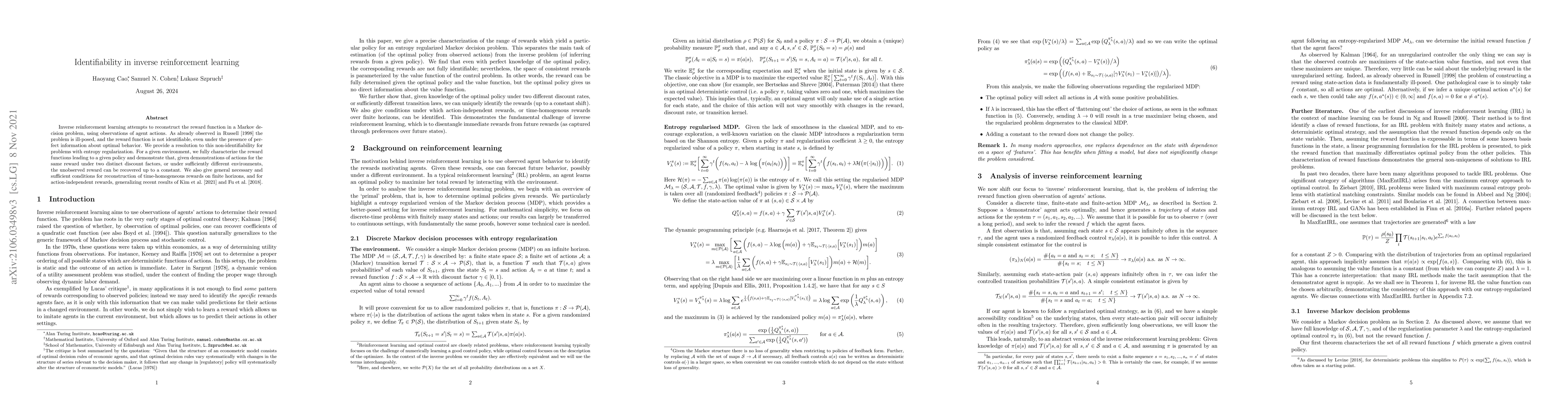 Inverse reinforcement learning attempts to reconstruct the reward function in a Markov decision problem, using observations of agent actions. As already observed in Russell [1998] the problem is ill-posed, and the reward function is not identifiable, even under the presence of perfect information about optimal behavior. We provide a resolution to this non-identifiability for problems with entropy regularization. For a given environment, we fully characterize the reward functions leading to a given policy and demonstrate that, given demonstrations of actions for the same reward under two distinct discount factors, or under sufficiently different environments, the unobserved reward can be recovered up to a constant. We also give general necessary and sufficient conditions for reconstruction of time-homogeneous rewards on finite horizons, and for action-independent rewards, generalizing recent results of Kim et al. [2021] and Fu et al. [2018].
