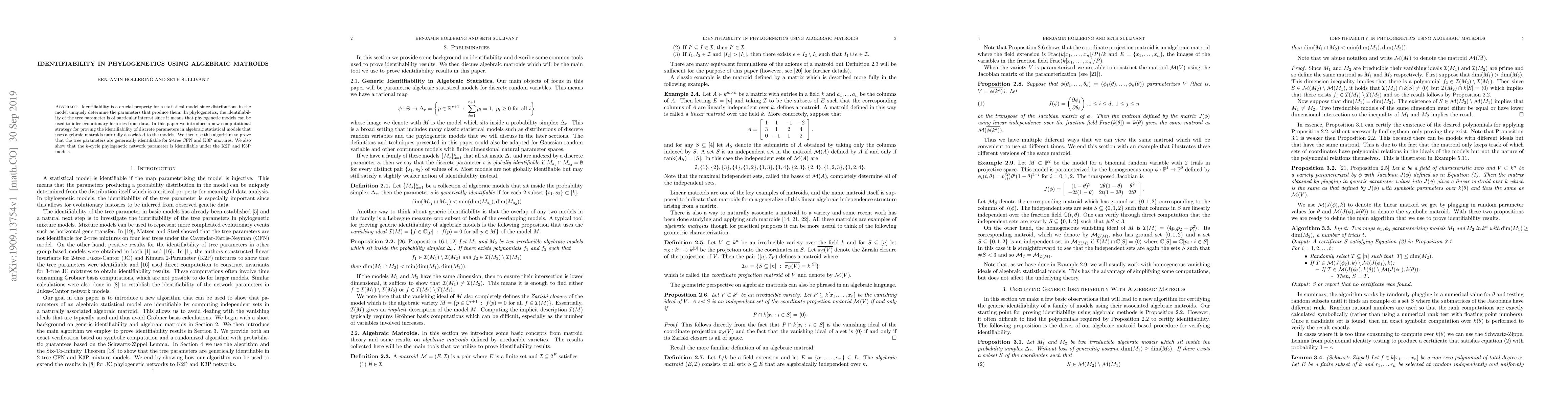 This paper proposes a novel computational method using algebraic matroids to prove identifiability in phylogenetic models, demonstrating its application to 2-tree CFN and K3P mixtures and showing that tree and $k$-cycle network parameters are identifiable under K2P and K3P models.