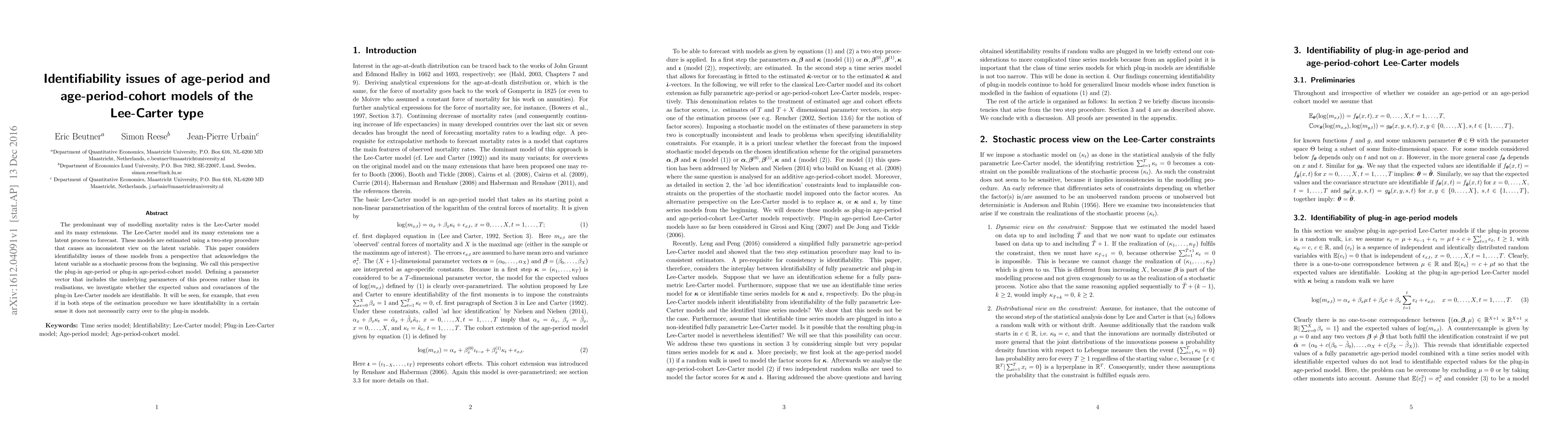 The predominant way of modelling mortality rates is the Lee-Carter model and its many extensions. The Lee-Carter model and its many extensions use a latent process to forecast. These models are estimated using a two-step procedure that causes an inconsistent view on the latent variable. This paper considers identifiability issues of these models from a perspective that acknowledges the latent variable as a stochastic process from the beginning. We call this perspective the plug-in age-period or plug-in age-period-cohort model. Defining a parameter vector that includes the underlying parameters of this process rather than its realisations, we investigate whether the expected values and covariances of the plug-in Lee-Carter models are identifiable. It will be seen, for example, that even if in both steps of the estimation procedure we have identifiability in a certain sense it does not necessarily carry over to the plug-in models.