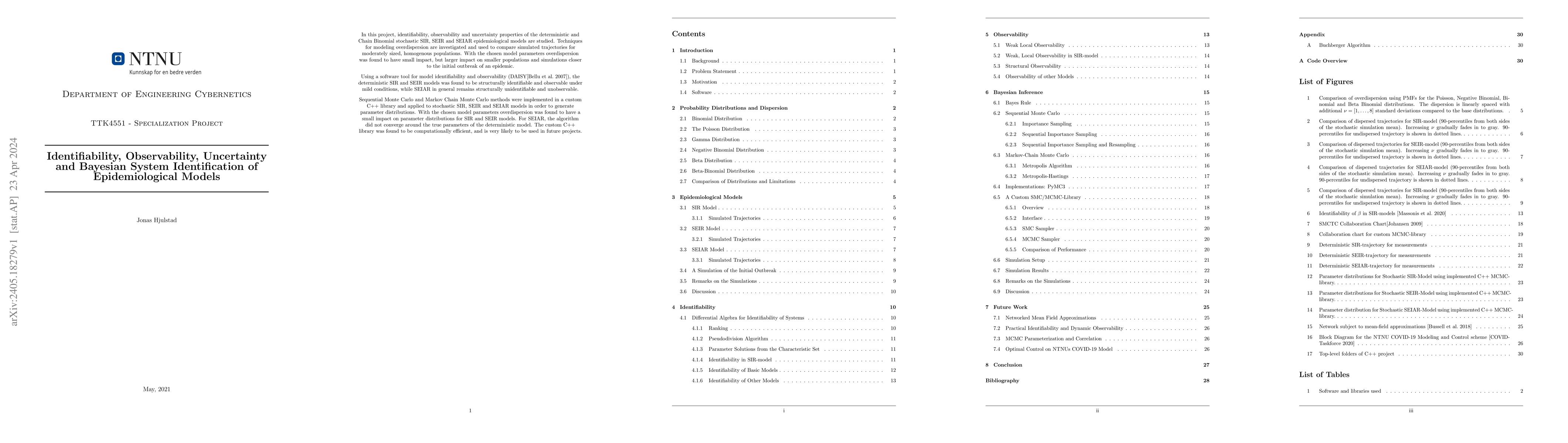 In this project, identifiability, observability and uncertainty properties of the deterministic and Chain Binomial stochastic SIR, SEIR and SEIAR epidemiological models are studied. Techniques for modeling overdispersion are investigated and used to compare simulated trajectories for moderately sized, homogenous populations. With the chosen model parameters overdispersion was found to have small impact, but larger impact on smaller populations and simulations closer to the initial outbreak of an epidemic. Using a software tool for model identifiability and observability (DAISY[Bellu et al. 2007]), the deterministic SIR and SEIR models was found to be structurally identifiable and observable under mild conditions, while SEIAR in general remains structurally unidentifiable and unobservable. Sequential Monte Carlo and Markov Chain Monte Carlo methods were implemented in a custom C++ library and applied to stochastic SIR, SEIR and SEIAR models in order to generate parameter distributions. With the chosen model parameters overdispersion was found to have a small impact on parameter distributions for SIR and SEIR models. For SEIAR, the algorithm did not converge around the true parameters of the deterministic model. The custom C++ library was found to be computationally efficient, and is very likely to be used in future projects.