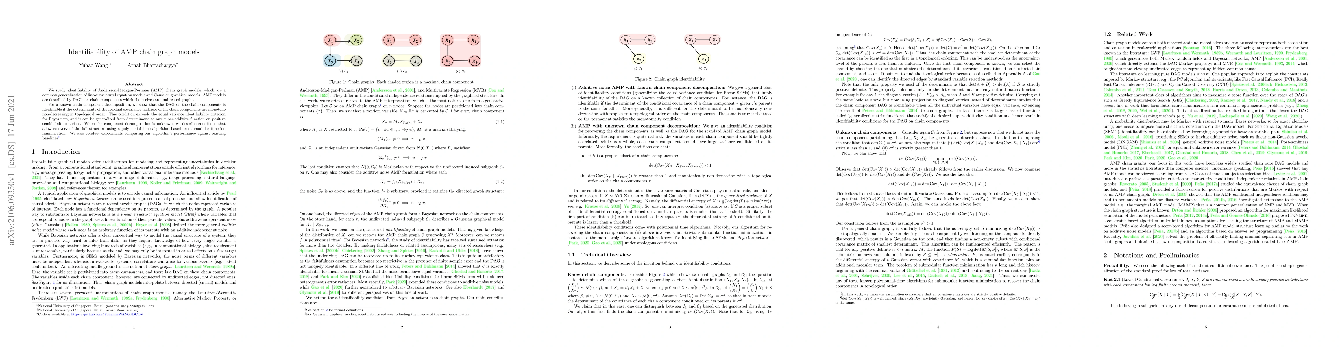 This paper investigates the identifiability of AMP chain graph models, showing that identifiability depends on the monotone non-decreasing determinants of the residual covariance matrices of chain components. It also presents a polynomial time algorithm for recovering the full structure when the component decomposition is unknown.