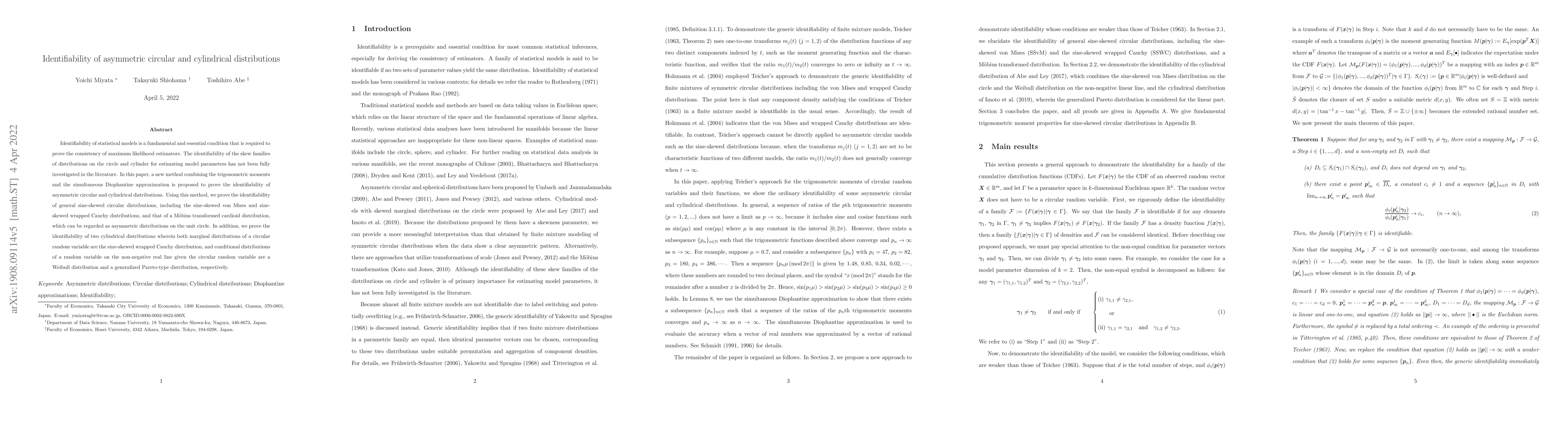 This paper proposes a novel method combining trigonometric moments and simultaneous Diophantine approximation to establish the identifiability of asymmetric circular and cylindrical distributions, including sine-skewed circular and cylindrical distributions, and Möbius transformed cardioid distributions. The method proves the identifiability of these distributions, ensuring the consistency of maximum likelihood estimators.