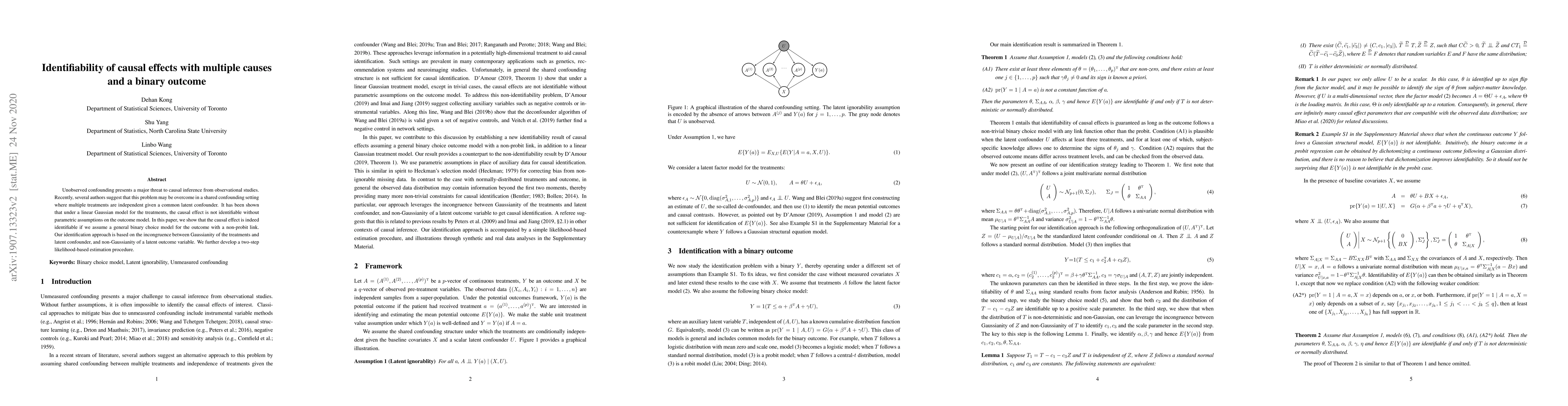 Unobserved confounding presents a major threat to causal inference from observational studies. Recently, several authors suggest that this problem may be overcome in a shared confounding setting where multiple treatments are independent given a common latent confounder. It has been shown that under a linear Gaussian model for the treatments, the causal effect is not identifiable without parametric assumptions on the outcome model. In this paper, we show that the causal effect is indeed identifiable if we assume a general binary choice model for the outcome with a non-probit link. Our identification approach is based on the incongruence between Gaussianity of the treatments and latent confounder, and non-Gaussianity of a latent outcome variable. We further develop a two-step likelihood-based estimation procedure.