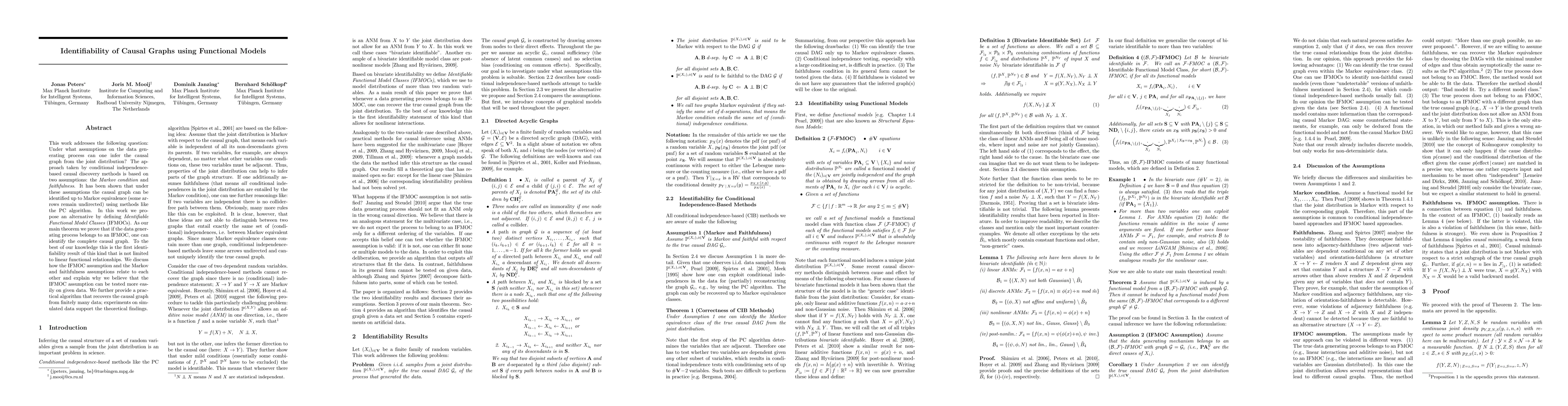 This work addresses the following question: Under what assumptions on the data generating process can one infer the causal graph from the joint distribution? The approach taken by conditional independence-based causal discovery methods is based on two assumptions: the Markov condition and faithfulness. It has been shown that under these assumptions the causal graph can be identified up to Markov equivalence (some arrows remain undirected) using methods like the PC algorithm. In this work we propose an alternative by defining Identifiable Functional Model Classes (IFMOCs). As our main theorem we prove that if the data generating process belongs to an IFMOC, one can identify the complete causal graph. To the best of our knowledge this is the first identifiability result of this kind that is not limited to linear functional relationships. We discuss how the IFMOC assumption and the Markov and faithfulness assumptions relate to each other and explain why we believe that the IFMOC assumption can be tested more easily on given data. We further provide a practical algorithm that recovers the causal graph from finitely many data; experiments on simulated data support the theoretical findings.