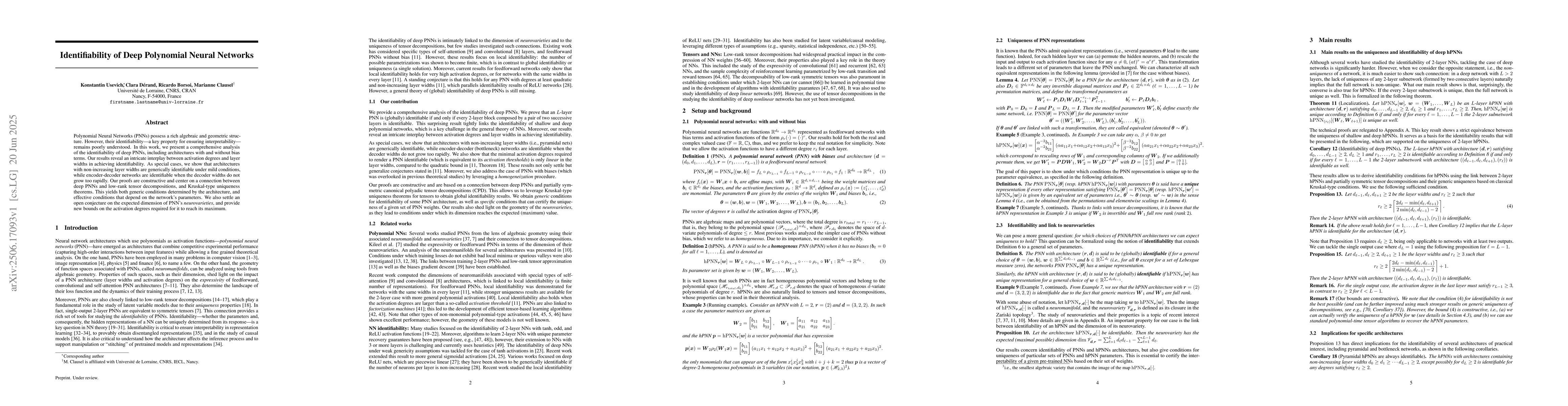 Polynomial Neural Networks (PNNs) possess a rich algebraic and geometric structure. However, their identifiability -- a key property for ensuring interpretability -- remains poorly understood. In this work, we present a comprehensive analysis of the identifiability of deep PNNs, including architectures with and without bias terms. Our results reveal an intricate interplay between activation degrees and layer widths in achieving identifiability. As special cases, we show that architectures with non-increasing layer widths are generically identifiable under mild conditions, while encoder-decoder networks are identifiable when the decoder widths do not grow too rapidly. Our proofs are constructive and center on a connection between deep PNNs and low-rank tensor decompositions, and Kruskal-type uniqueness theorems. This yields both generic conditions determined by the architecture, and effective conditions that depend on the network's parameters. We also settle an open conjecture on the expected dimension of PNN's neurovarieties, and provide new bounds on the activation degrees required for it to reach its maximum.