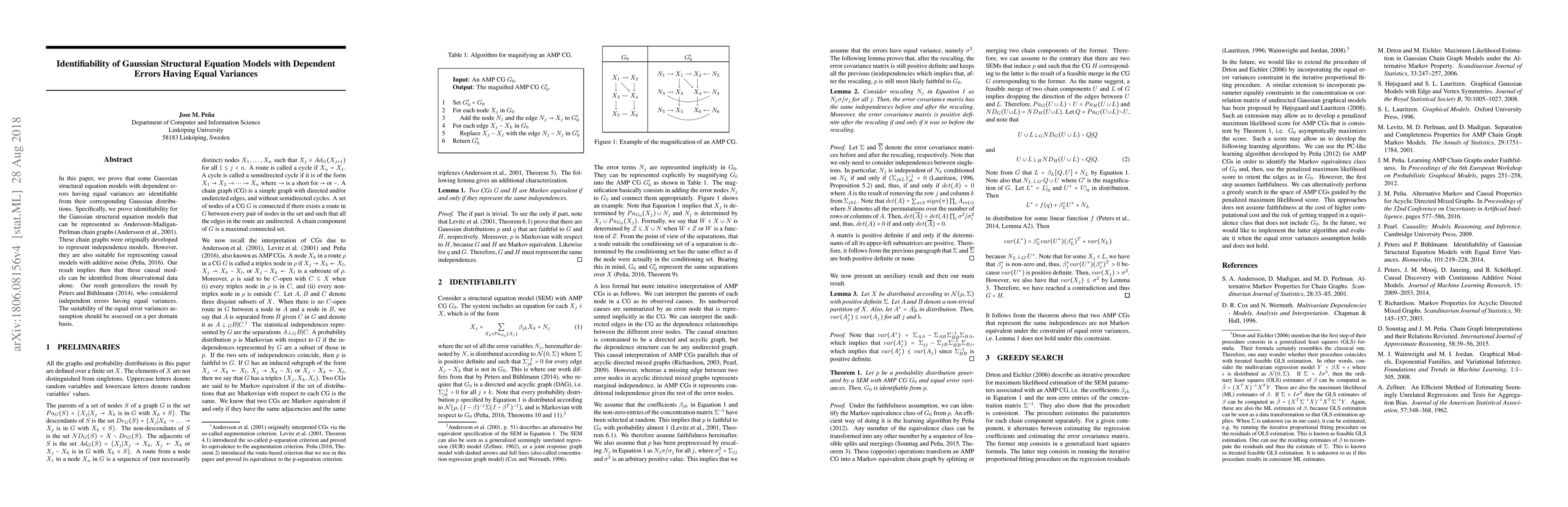 In this paper, we prove that some Gaussian structural equation models with dependent errors having equal variances are identifiable from their corresponding Gaussian distributions. Specifically, we prove identifiability for the Gaussian structural equation models that can be represented as Andersson-Madigan-Perlman chain graphs (Andersson et al., 2001). These chain graphs were originally developed to represent independence models. However, they are also suitable for representing causal models with additive noise (Pe\~na, 2016. Our result implies then that these causal models can be identified from observational data alone. Our result generalizes the result by Peters and B\"uhlmann (2014), who considered independent errors having equal variances. The suitability of the equal error variances assumption should be assessed on a per domain basis.
