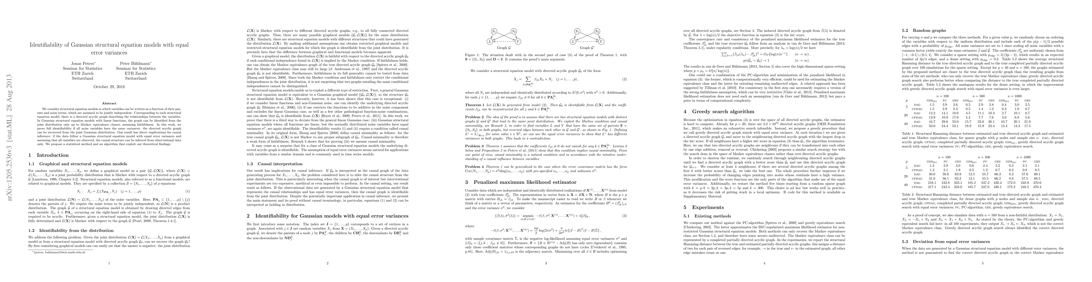 This paper proves that Gaussian structural equation models with equal error variances are fully identifiable, meaning the underlying directed acyclic graph can be recovered from the joint distribution. This result facilitates causal inference from observational data when all variables are observed.