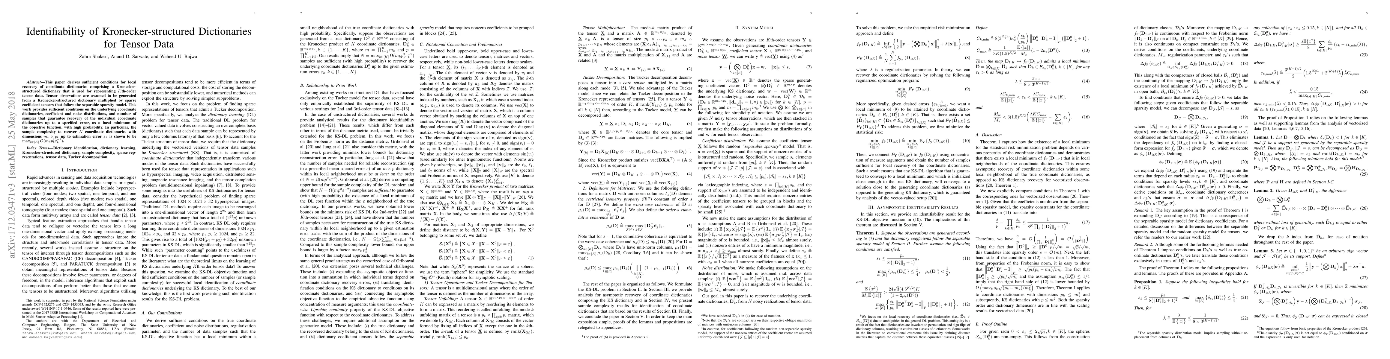 This paper derives sufficient conditions for local recovery of coordinate dictionaries comprising a Kronecker-structured dictionary that is used for representing $K$th-order tensor data. Tensor observations are assumed to be generated from a Kronecker-structured dictionary multiplied by sparse coefficient tensors that follow the separable sparsity model. This work provides sufficient conditions on the underlying coordinate dictionaries, coefficient and noise distributions, and number of samples that guarantee recovery of the individual coordinate dictionaries up to a specified error, as a local minimum of the objective function, with high probability. In particular, the sample complexity to recover $K$ coordinate dictionaries with dimensions $m_k \times p_k$ up to estimation error $\varepsilon_k$ is shown to be $\max_{k \in [K]}\mathcal{O}(m_kp_k^3\varepsilon_k^{-2})$.