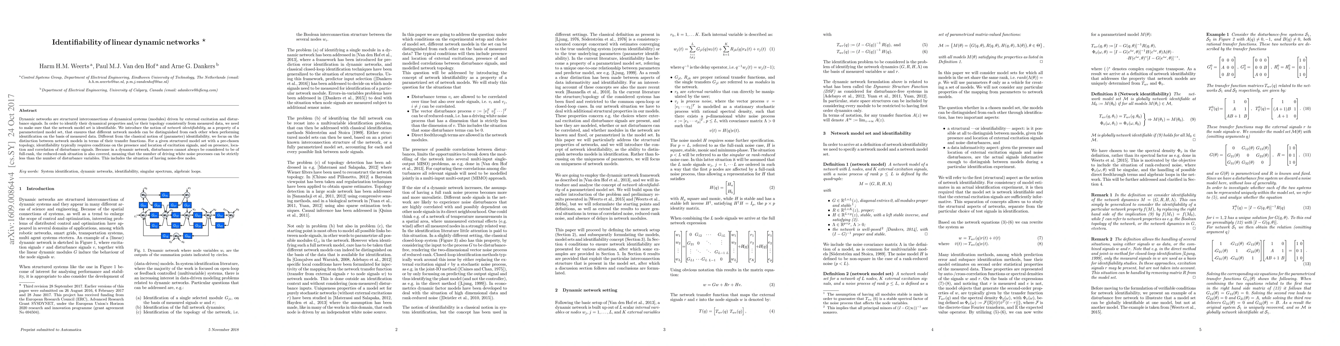 This paper introduces the concept of network identifiability for dynamic networks, ensuring that different network models can be distinguished based on measured data. It discusses conditions for identifiability, including the placement of excitation signals and the correlation of reduced-rank disturbance signals, even in noise-free nodes.