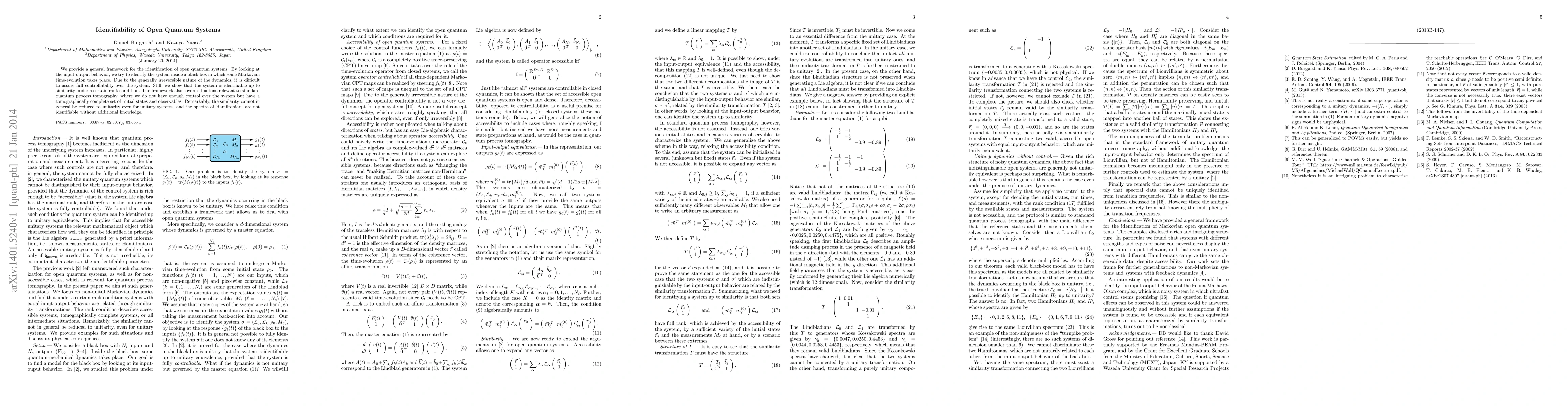 This paper presents a framework for identifying open quantum systems through their input-output behavior, demonstrating that systems are identifiable up to similarity under a rank condition, even when full controllability is not possible. The framework also applies to quantum process tomography, highlighting that similarity cannot generally be reduced to unitarity, and Hamiltonian spectra require additional information for identification.