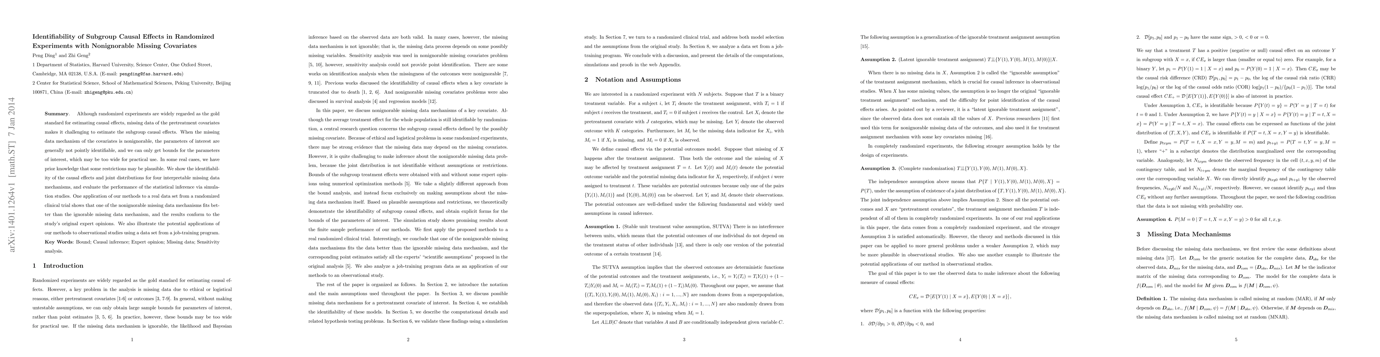 Although randomized experiments are widely regarded as the gold standard for estimating causal effects, missing data of the pretreatment covariates makes it challenging to estimate the subgroup causal effects. When the missing data mechanism of the covariates is nonignorable, the parameters of interest are generally not pointly identifiable, and we can only get bounds for the parameters of interest, which may be too wide for practical use. In some real cases, we have prior knowledge that some restrictions may be plausible. We show the identifiability of the causal effects and joint distributions for four interpretable missing data mechanisms, and evaluate the performance of the statistical inference via simulation studies. One application of our methods to a real data set from a randomized clinical trial shows that one of the nonignorable missing data mechanisms fits better than the ignorable missing data mechanism, and the results conform to the study's original expert opinions. We also illustrate the potential applications of our methods to observational studies using a data set from a job-training program.