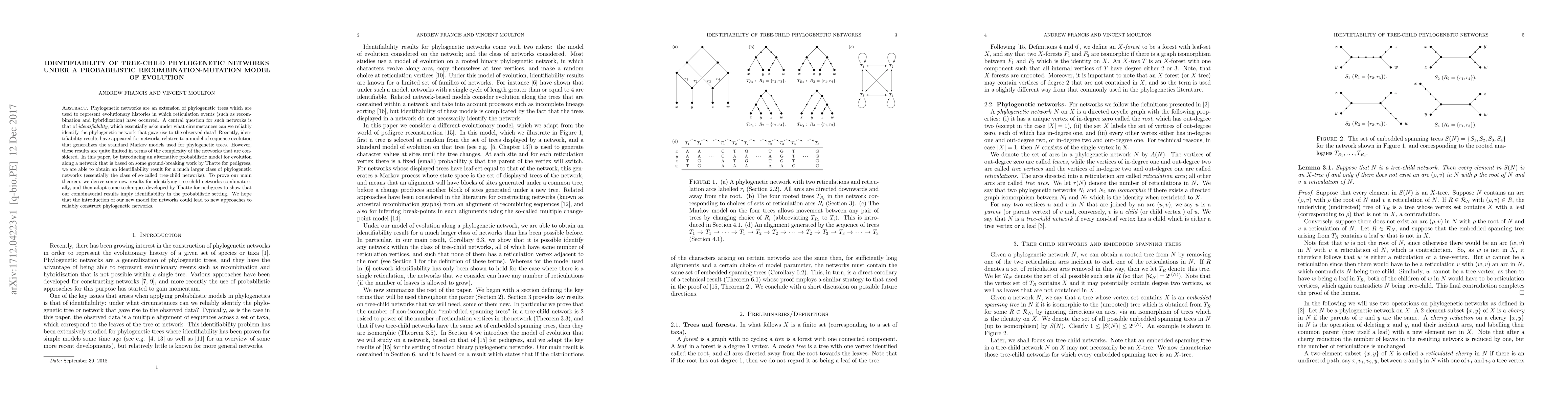 This paper presents an identifiability result for tree-child phylogenetic networks under a new probabilistic recombination-mutation model, extending beyond previous limited results for more complex networks. The authors derive new combinatorial results and adapt techniques to show that their model can reliably identify the underlying network structure.