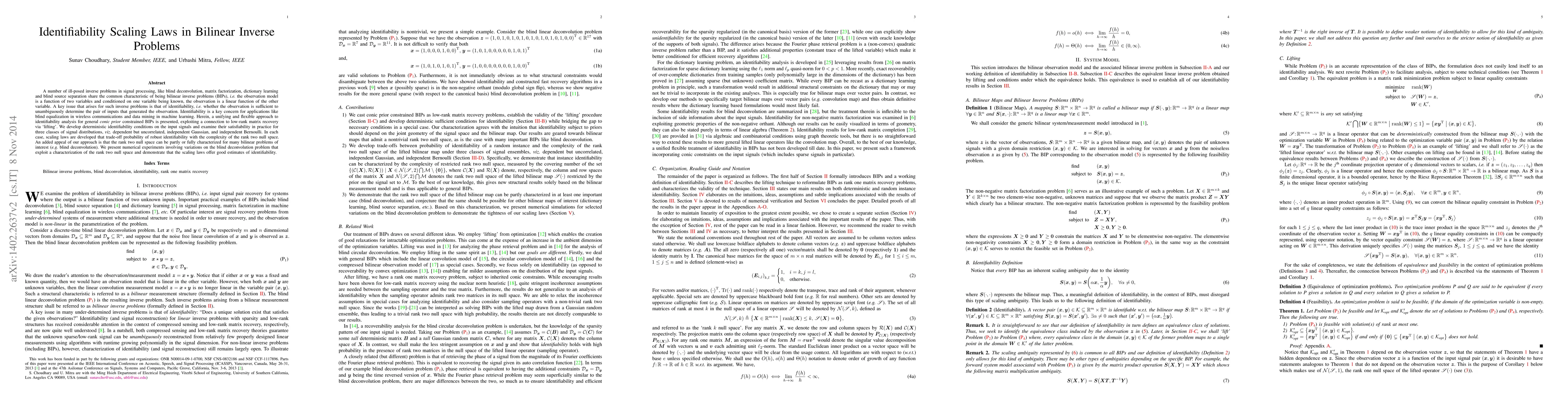 This paper presents a unifying approach to analyzing identifiability in bilinear inverse problems (BIPs), focusing on conditions under which observations can uniquely determine input signals. It develops scaling laws that balance identifiability probability with the complexity of the rank two null space, validated through numerical experiments on blind deconvolution.