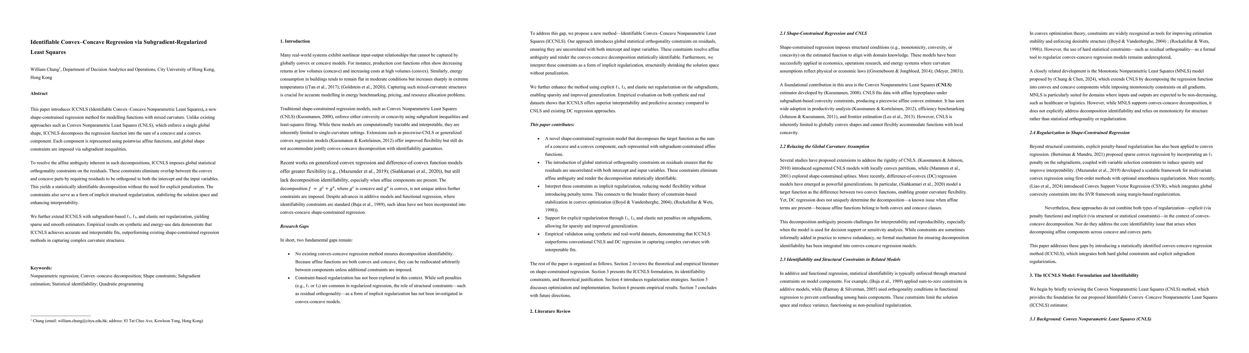 We propose a novel nonparametric regression method that models complex input-output relationships as the sum of convex and concave components. The method-Identifiable Convex-Concave Nonparametric Least Squares (ICCNLS)-decomposes the target function into additive shape-constrained components, each represented via sub-gradient-constrained affine functions. To address the affine ambiguity inherent in convex-concave decompositions, we introduce global statistical orthogonality constraints, ensuring that residuals are uncorrelated with both intercept and input variables. This enforces decomposition identifiability and improves interpretability. We further incorporate L1, L2 and elastic net regularisation on sub-gradients to enhance generalisation and promote structural sparsity. The proposed method is evaluated on synthetic and real-world datasets, including healthcare pricing data, and demonstrates improved predictive accuracy and model simplicity compared to conventional CNLS and difference-of-convex (DC) regression approaches. Our results show that statistical identifiability, when paired with convex-concave structure and sub-gradient regularisation, yields interpretable models suited for forecasting, benchmarking, and policy evaluation.