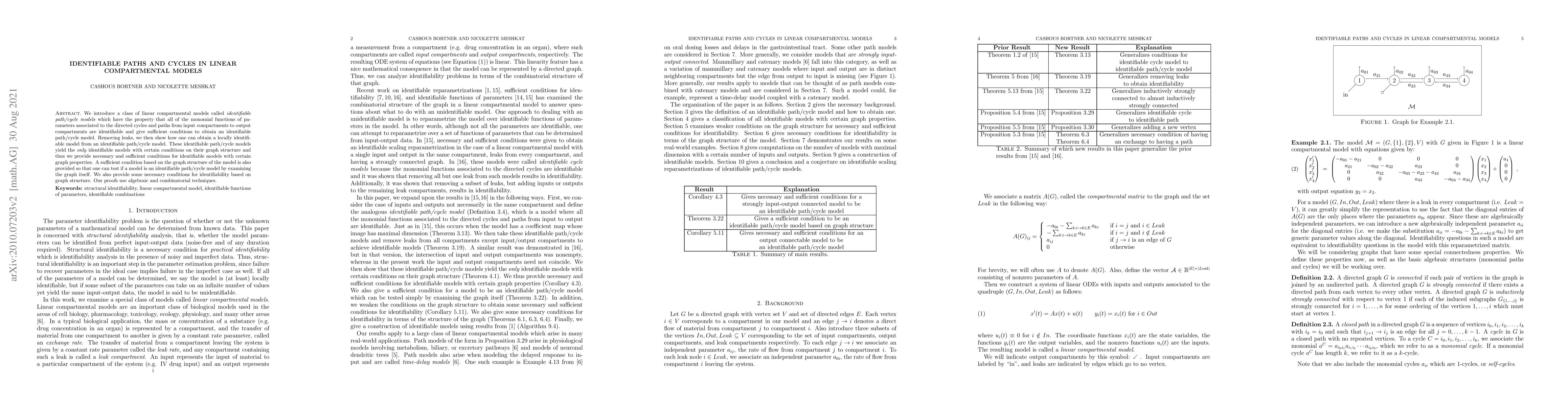 This paper introduces identifiable path/cycle models in linear compartmental systems, ensuring all parameter-associated monomials are identifiable. It provides conditions for local identifiability and necessary/sufficient criteria for models with specific graph structures, using algebraic and combinatorial techniques.