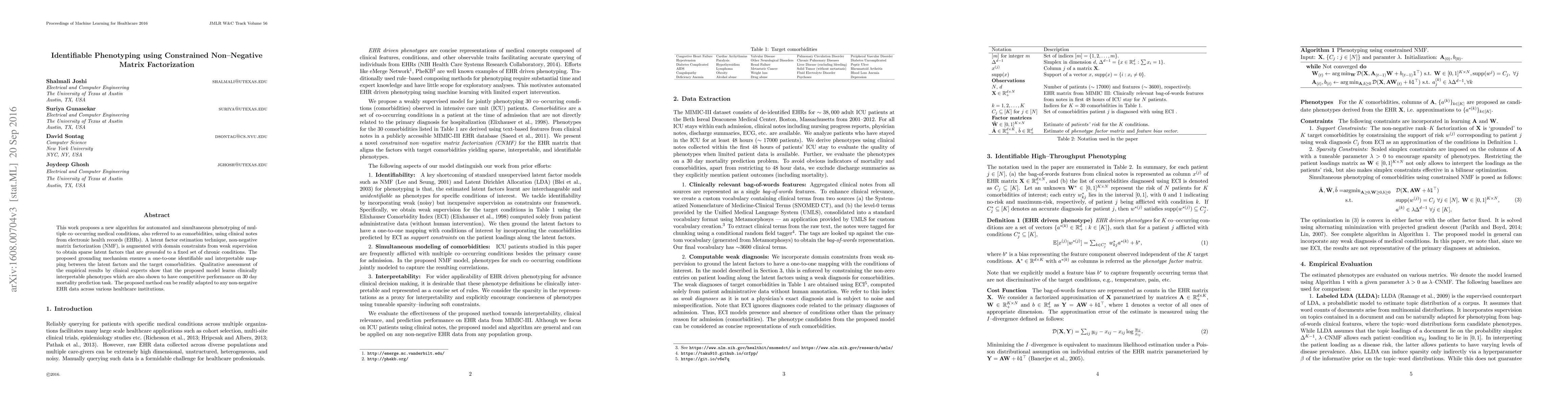This paper introduces an enhanced non-negative matrix factorization algorithm with domain-specific constraints for phenotyping multiple comorbidities from EHRs, ensuring identifiable and interpretable mappings to chronic conditions, and showing predictive value for 30-day mortality. Clinical validation indicates the model's clinically relevant outcomes.