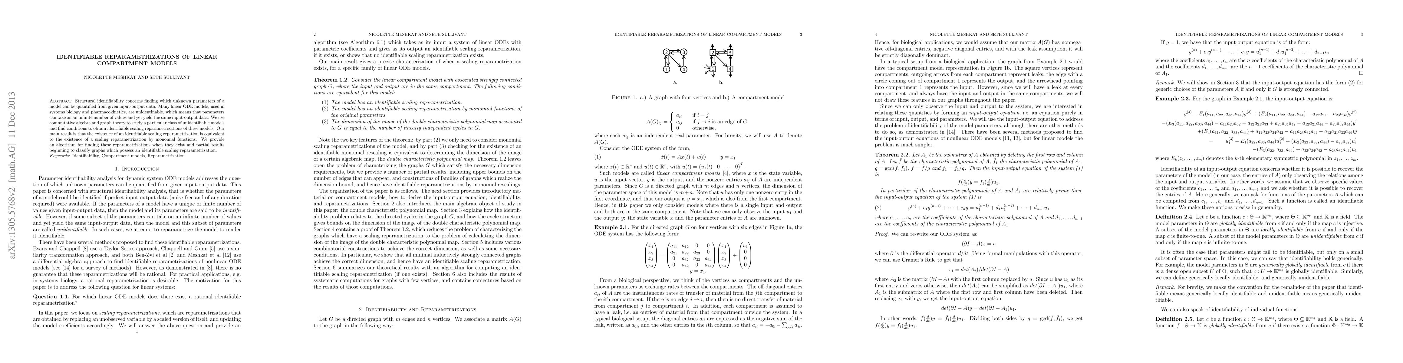 Identifiability concerns finding which unknown parameters of a model can be quantified from given input-output data. Many linear ODE models, used in systems biology and pharmacokinetics, are unidentifiable, which means that parameters can take on an infinite number of values and yet yield the same input-output data. We use commutative algebra and graph theory to study a particular class of unidentifiable models and find conditions to obtain identifiable scaling reparametrizations of these models. Our main result is that the existence of an identifiable scaling reparametrization is equivalent to the existence of a scaling reparametrization by monomial functions. We also provide partial results beginning to classify graphs which possess an identifiable scaling reparametrization.