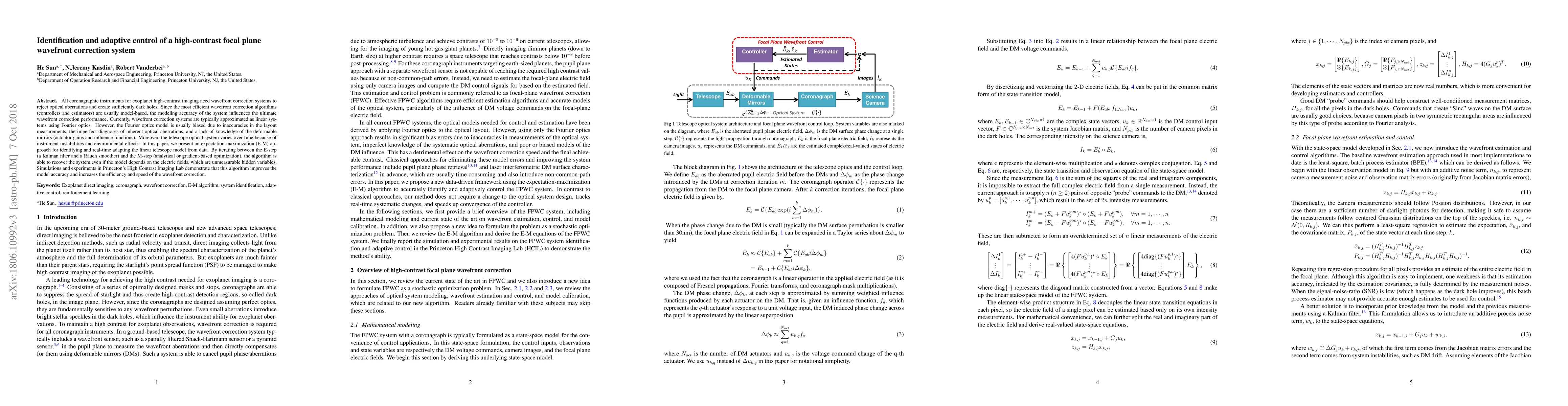 This paper proposes an expectation-maximization approach to identify and adaptively correct wavefront aberrations in coronagraphic instruments for exoplanet imaging. The method improves model accuracy and enhances the efficiency of wavefront correction by real-time adaptation, demonstrated through simulations and experiments.