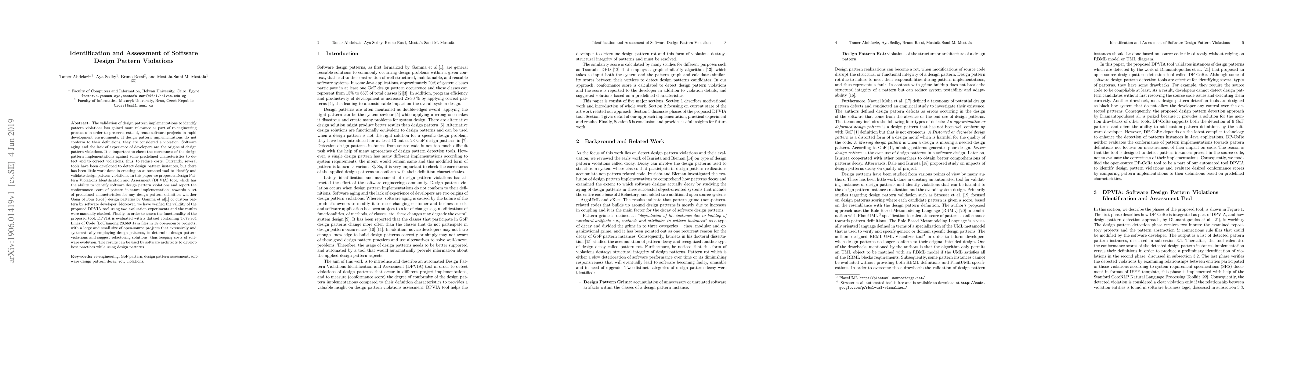 The research proposes DPVIA, an automated tool for identifying and assessing software design pattern violations using conformance scores against predefined characteristics. It evaluates the tool with two experiments and a dataset of 15 open-source Java projects.
