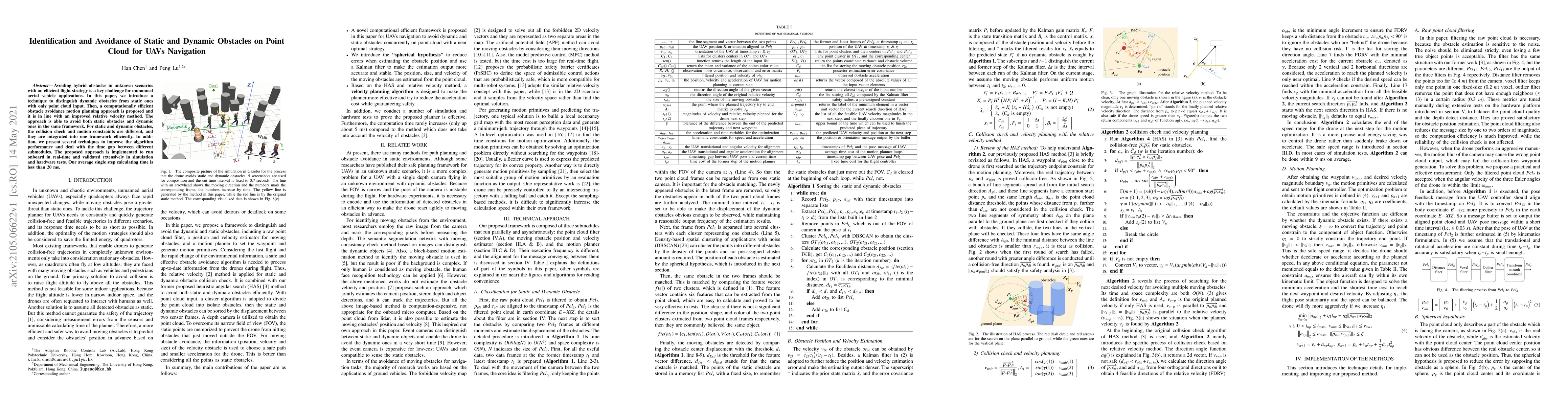 This paper presents a method to distinguish and avoid both static and dynamic obstacles using point cloud data for UAV navigation. It proposes an efficient motion planning approach integrated with an improved relative velocity method, validated through extensive simulation and hardware tests, achieving real-time performance with an average calculation time of less than 20 ms.