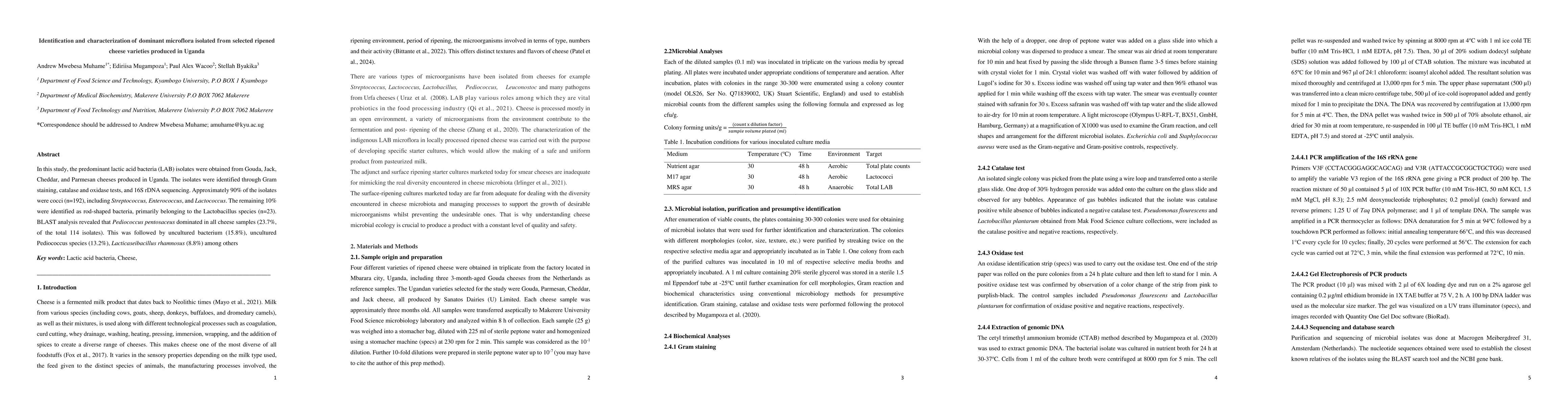 This study identifies and characterizes the dominant microflora in four Ugandan cheese varieties using Gram staining, catalase and oxidase tests, and 16S rDNA sequencing. The predominant lactic acid bacteria, Pediococcus pentosaceus, were found to constitute 23.7% of the isolates, followed by other species including Lacticaseibacillus rhamnosus.