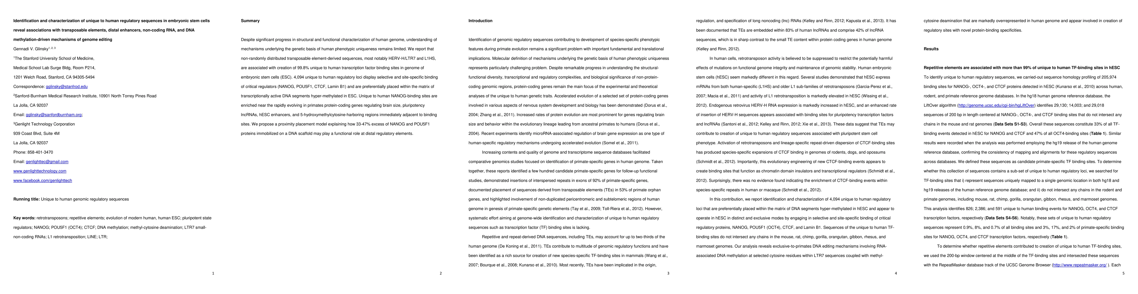 This paper identifies unique regulatory sequences in human embryonic stem cells linked to transposable elements, enhancers, and DNA methylation, revealing that HERV-H/LTR7 and L1HS elements contribute to 99.8% of human-specific transcription factor binding sites. It suggests a proximity placement model explaining the functional role of NANOG and POU5F1 proteins in regulating distal regulatory elements.