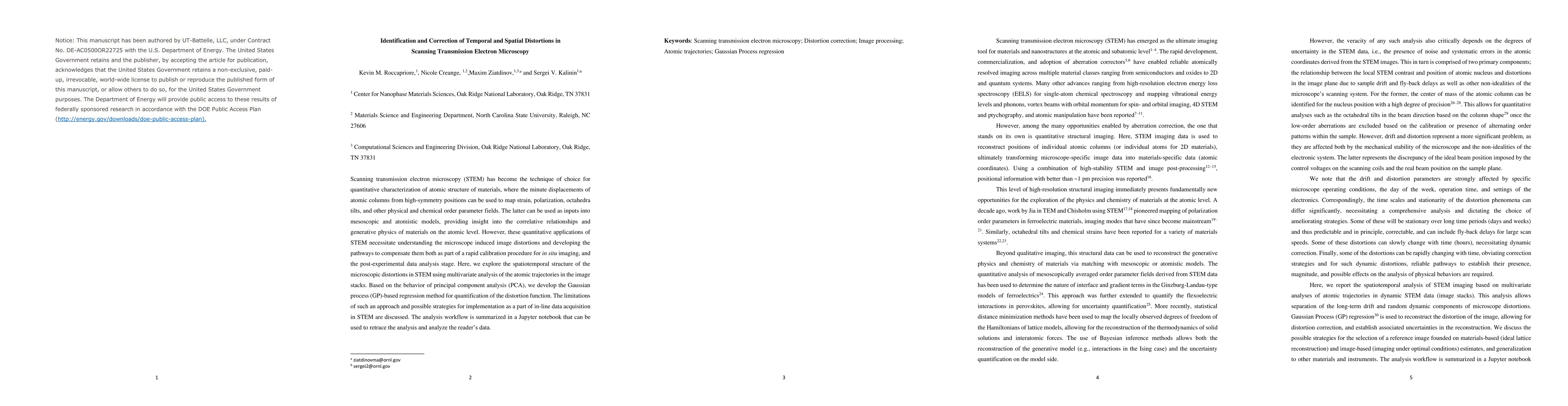 Scanning transmission electron microscopy (STEM) has become the technique of choice for quantitative characterization of atomic structure of materials, where the minute displacements of atomic columns from high-symmetry positions can be used to map strain, polarization, octahedra tilts, and other physical and chemical order parameter fields. The latter can be used as inputs into mesoscopic and atomistic models, providing insight into the correlative relationships and generative physics of materials on the atomic level. However, these quantitative applications of STEM necessitate understanding the microscope induced image distortions and developing the pathways to compensate them both as part of a rapid calibration procedure for in situ imaging, and the post-experimental data analysis stage. Here, we explore the spatiotemporal structure of the microscopic distortions in STEM using multivariate analysis of the atomic trajectories in the image stacks. Based on the behavior of principal component analysis (PCA), we develop the Gaussian process (GP)-based regression method for quantification of the distortion function. The limitations of such an approach and possible strategies for implementation as a part of in-line data acquisition in STEM are discussed. The analysis workflow is summarized in a Jupyter notebook that can be used to retrace the analysis and analyze the reader's data.