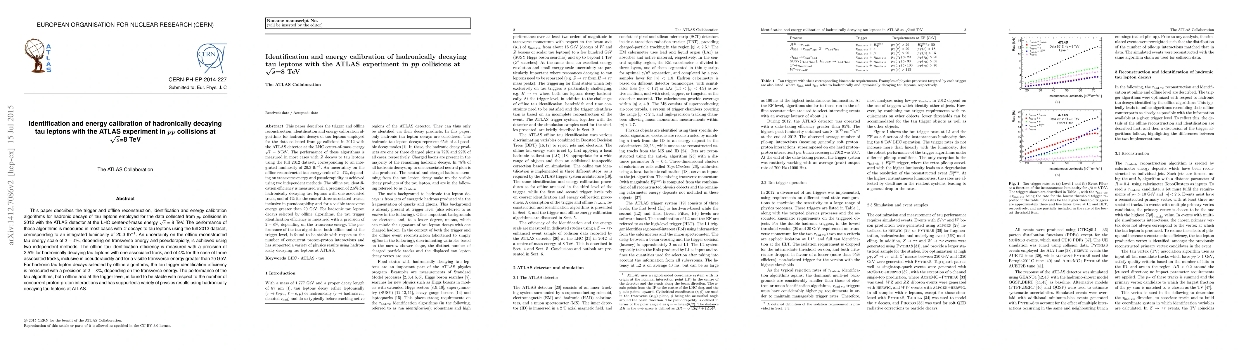 This paper details the identification and energy calibration of hadronically decaying tau leptons in the ATLAS experiment during $pp$ collisions at $\sqrt{s} = 8$ TeV, achieving an energy scale uncertainty of $2-4\%$ and an identification efficiency of $2.5-8\%$. The algorithms' performance is stable across varying interaction rates and have been instrumental in various physics analyses.