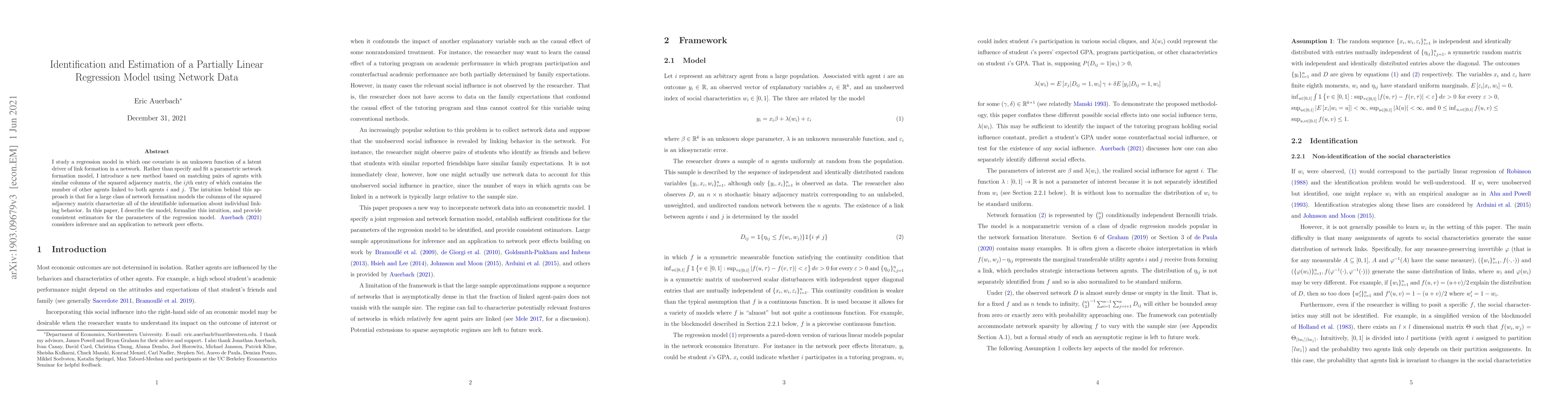 I study a regression model in which one covariate is an unknown function of a latent driver of link formation in a network. Rather than specify and fit a parametric network formation model, I introduce a new method based on matching pairs of agents with similar columns of the squared adjacency matrix, the ijth entry of which contains the number of other agents linked to both agents i and j. The intuition behind this approach is that for a large class of network formation models the columns of the squared adjacency matrix characterize all of the identifiable information about individual linking behavior. In this paper, I describe the model, formalize this intuition, and provide consistent estimators for the parameters of the regression model. Auerbach (2021) considers inference and an application to network peer effects.