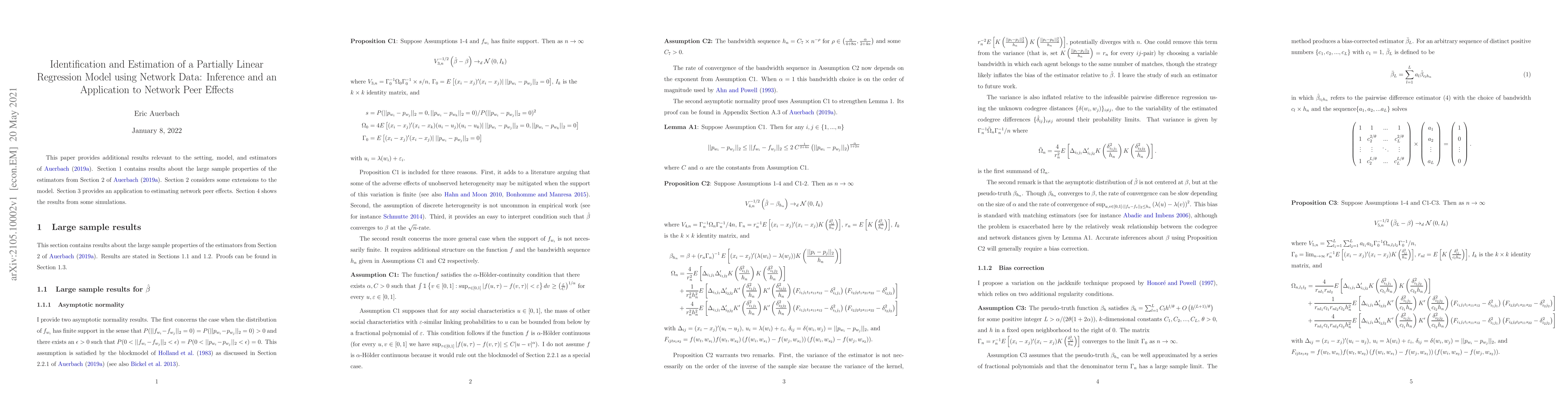 This paper provides additional results relevant to the setting, model, and estimators of Auerbach (2019a). Section 1 contains results about the large sample properties of the estimators from Section 2 of Auerbach (2019a). Section 2 considers some extensions to the model. Section 3 provides an application to estimating network peer effects. Section 4 shows the results from some simulations.
