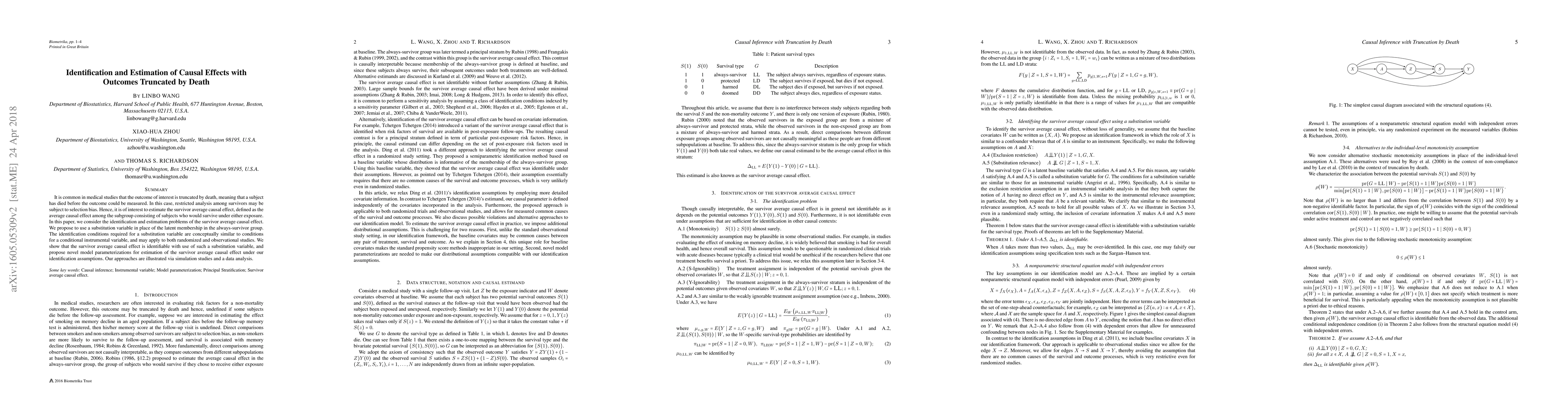 This paper addresses the challenge of estimating causal effects when outcomes are truncated by death in medical studies. It proposes using a substitution variable to identify and estimate the survivor average causal effect, demonstrating its applicability through simulations and data analysis.