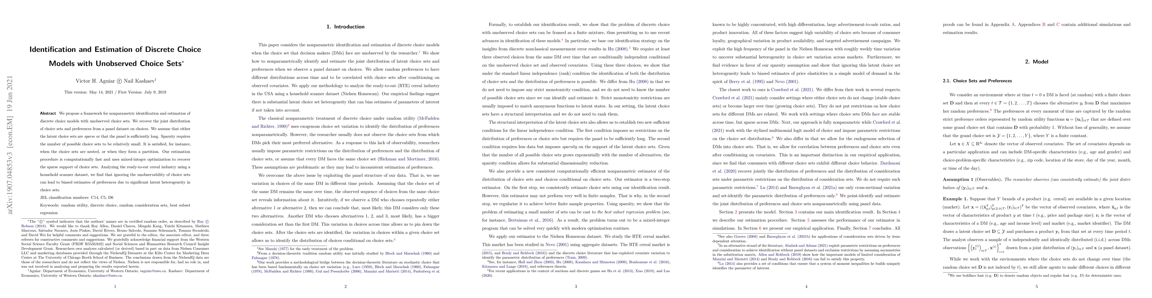 The paper proposes a framework for nonparametric identification and estimation of discrete choice models with unobserved choice sets using a panel dataset on choices, assuming either sparsity of latent choice sets or a sufficiently long panel.