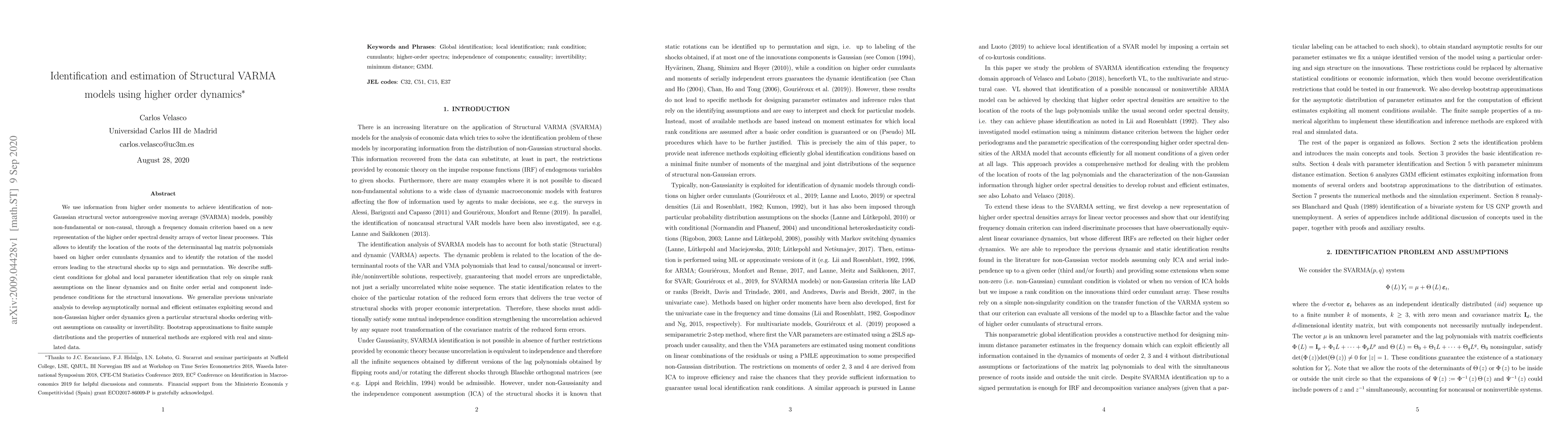 This paper identifies and estimates non-Gaussian structural vector autoregressive moving average (SVARMA) models using higher order moments and frequency domain criteria. It proposes a method for identifying model parameters and structural shocks based on higher order cumulants, without requiring assumptions of causality or invertibility.